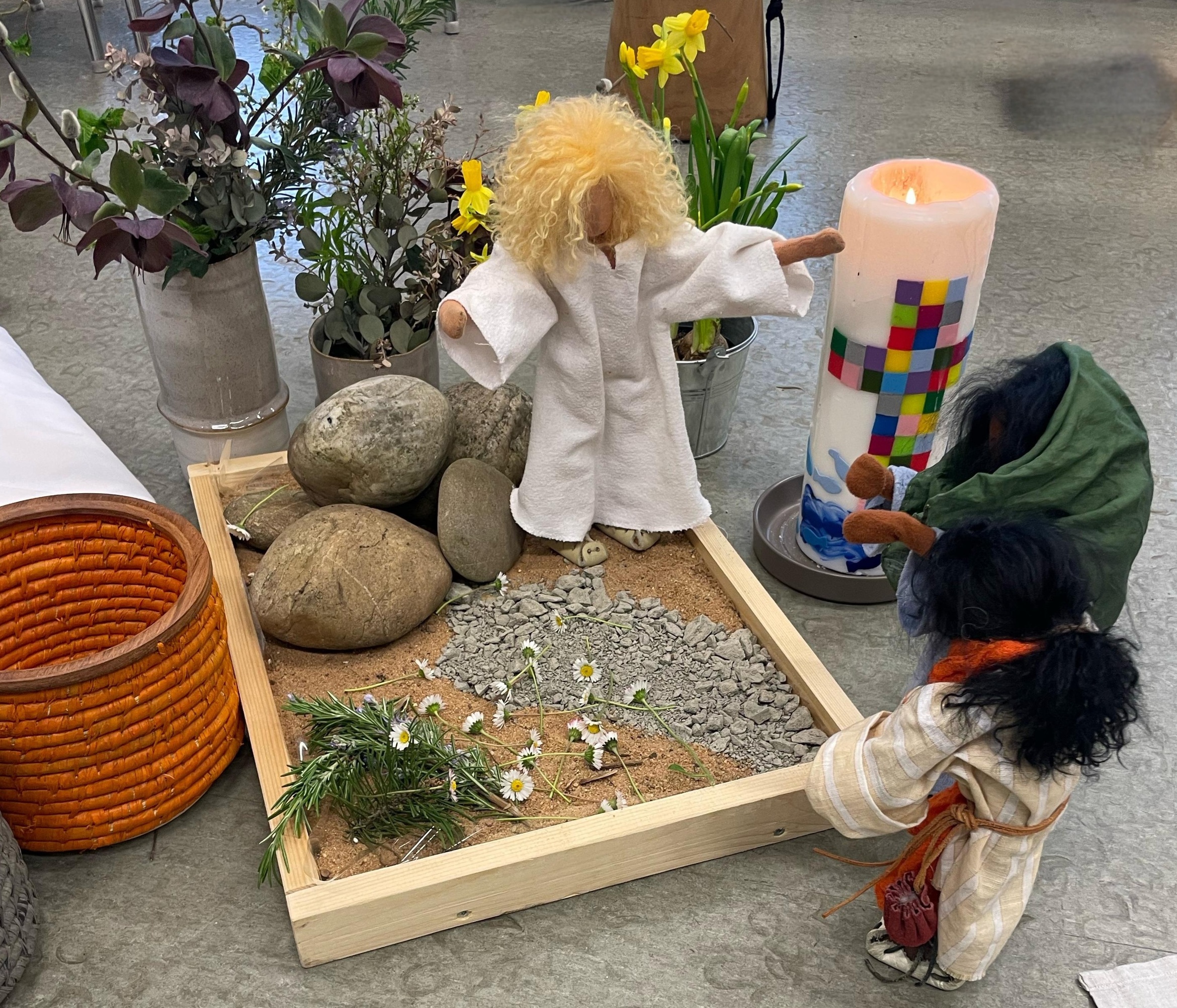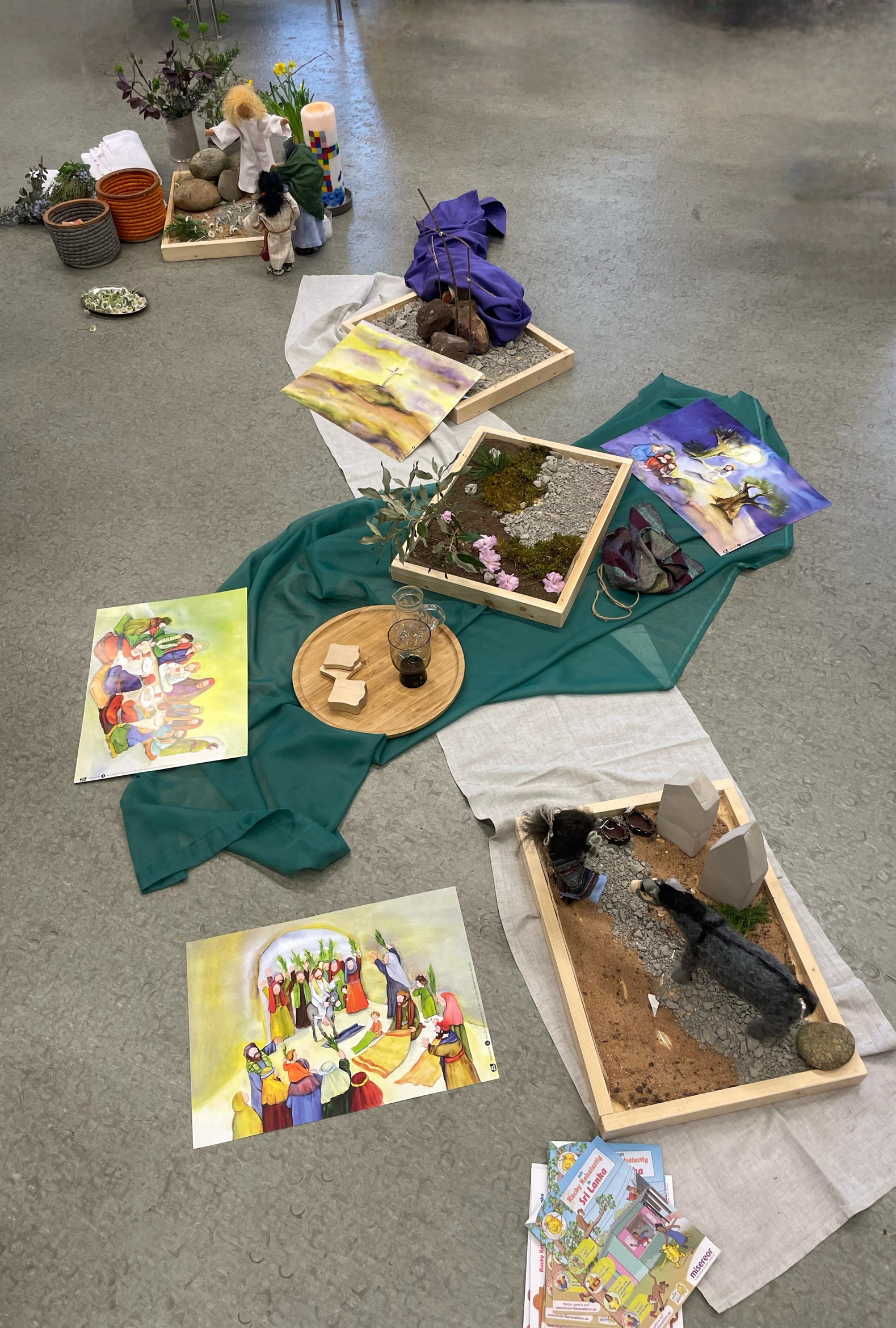 Als dann am Sonntag sich fast 100 Menschen im Pfarrsaal versammelten, konnte man die immer fröhlicher werdende Stimmung deutlich hören. Die Karwoche wurde anhand gestalteter Mini-Stationen noch mal Revue passieren lassen. Nachdem bei einem Rollenspiel deutlich zu sehen war, dass das Grab leer war – und der Engel verkündete, dass Jesus auferstanden ist, erklangen viele Schellen, Glöckchen und Rasseln und heitere Halleluja-Lieder. Ein kleiner Freudentanz zum Abschluss drinnen und die Eiersuche draußen erfreuten die Kinder besonders.