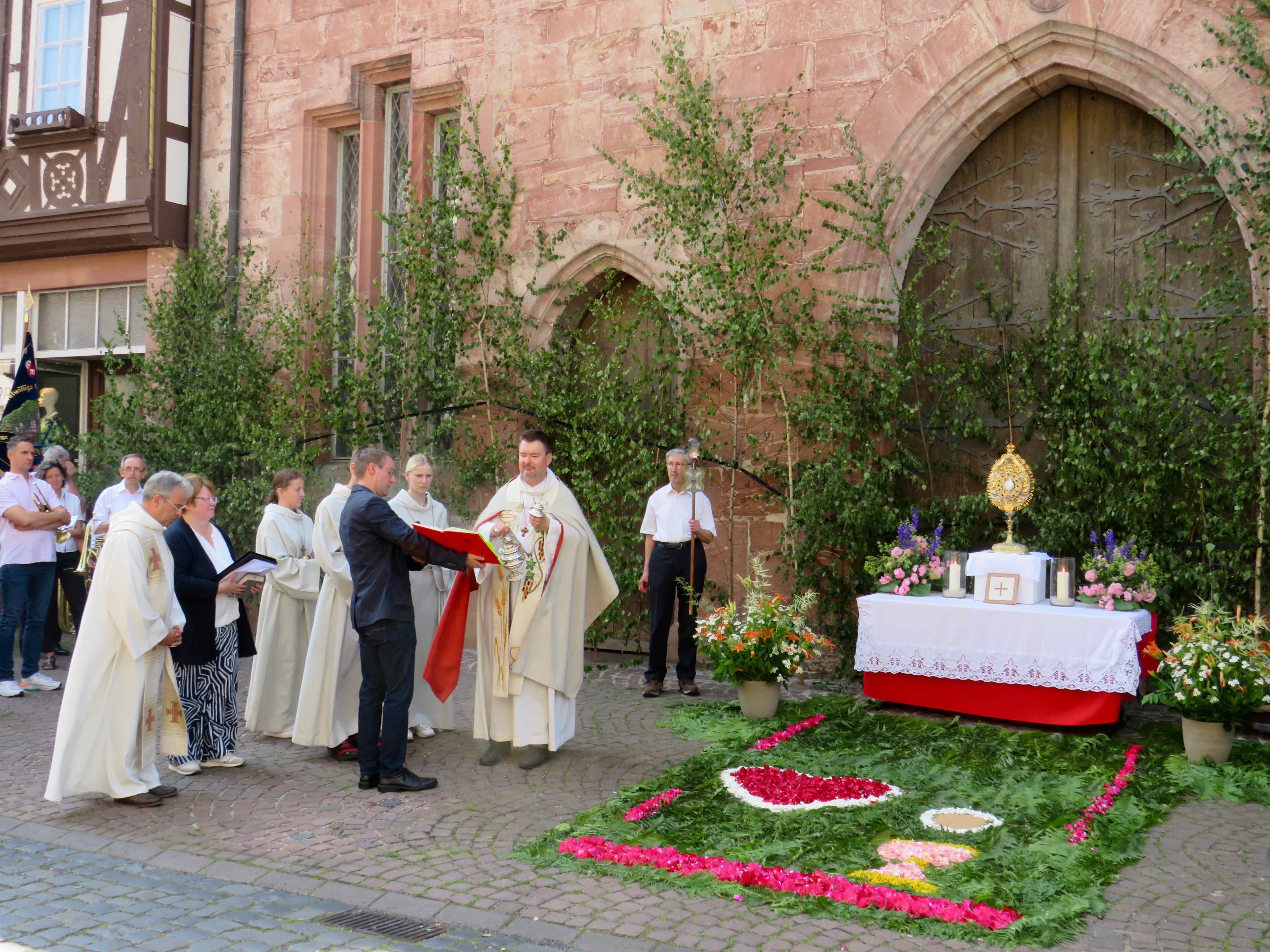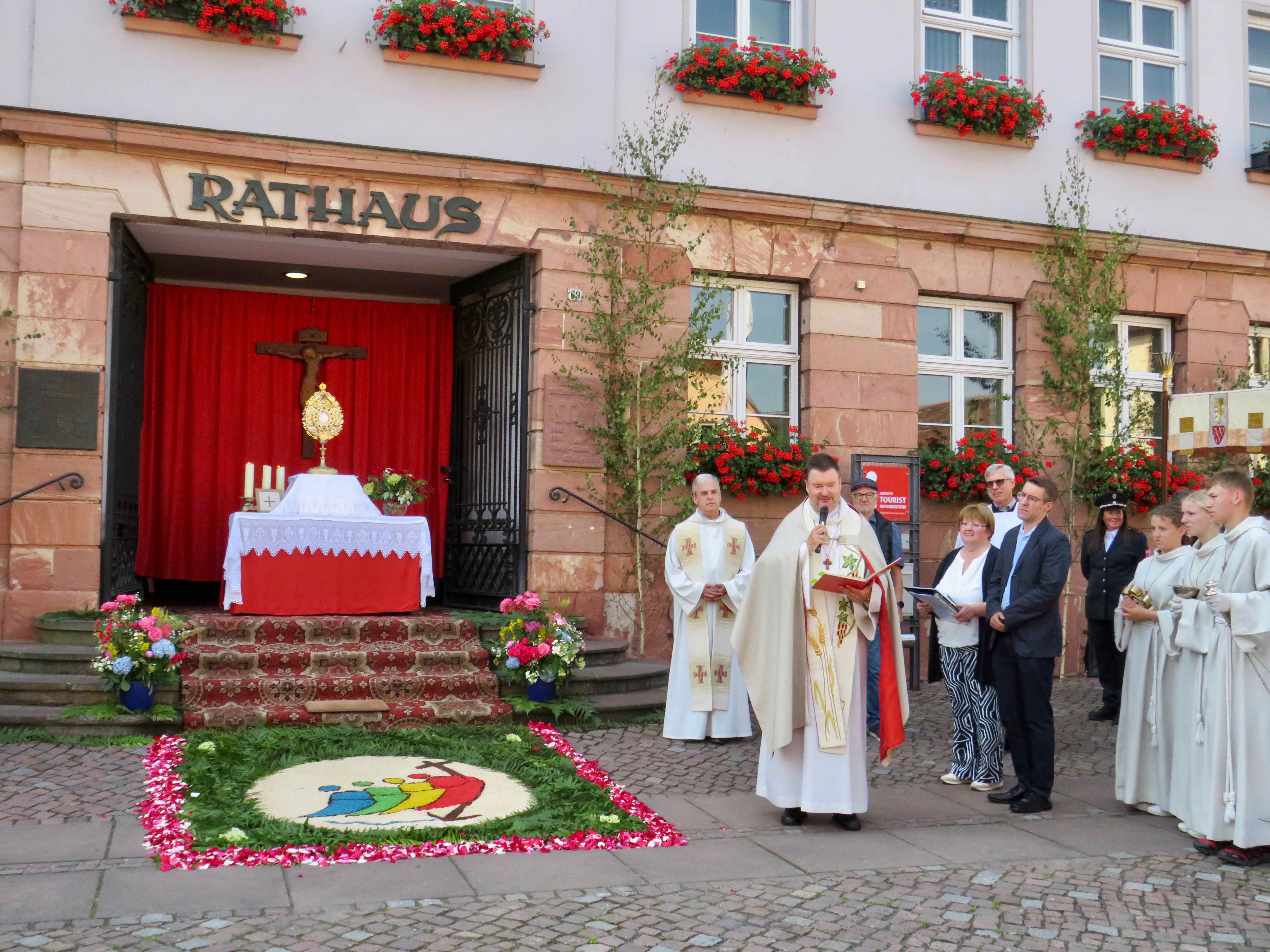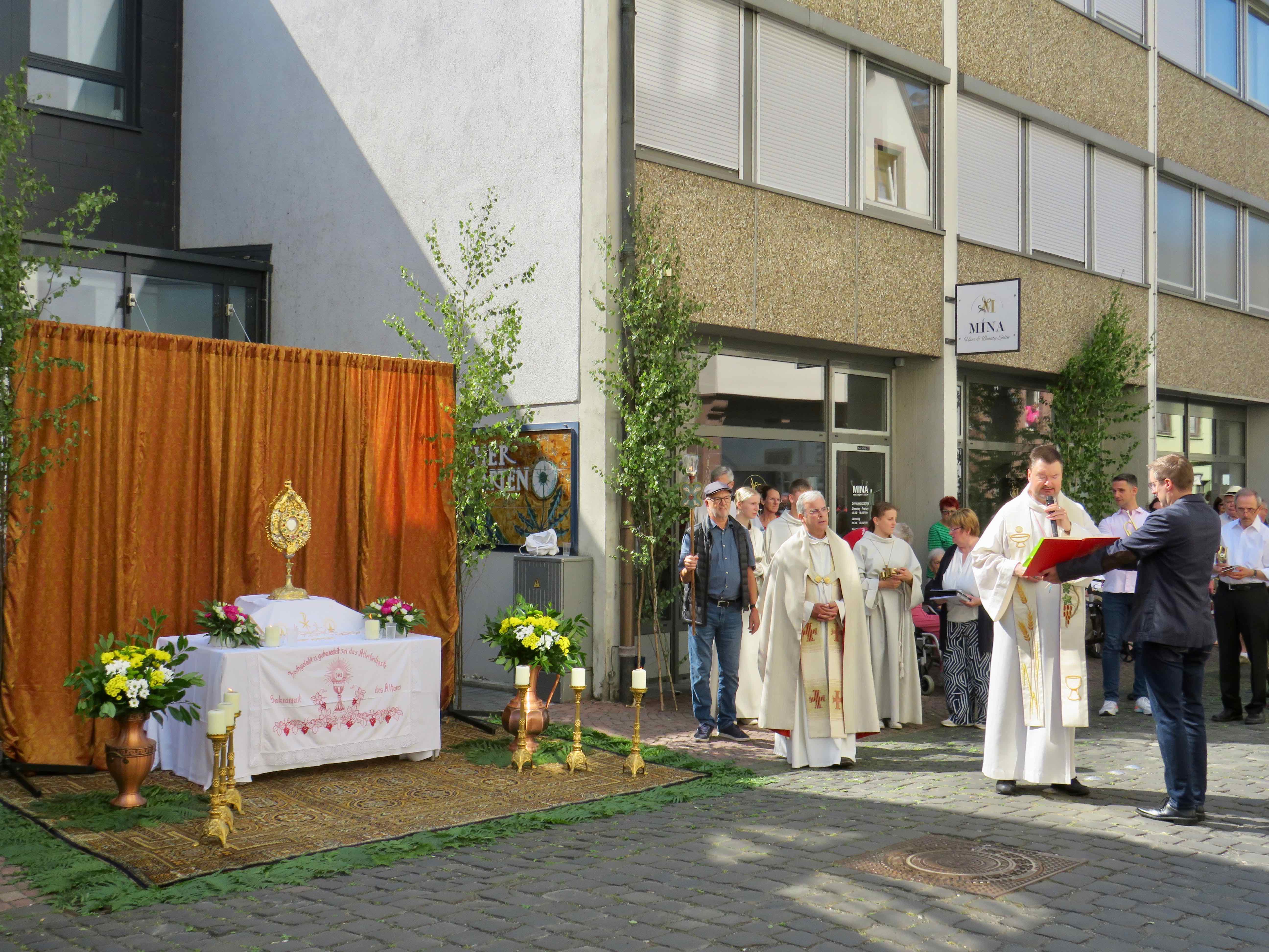 Am 1. Altar am Rathaus stellte Pfarrer Kölbel heraus, dass in den Fürbitten besonders für alle, die für die Stadt Verantwortung hätten, aber auch für die Mitarbeiter der Caritas, die sich für Menschen in Notlagen einsetzten sowie für eine gute Ökumene gebetet werde. Außerdem verkündete der Pfarrer das Evangelium und das „Tantum Ergo“ wurde gesungen. Das Allerheiligste in der Monstranz wurde verehrt und der Pfarrer erteilte den eucharistischen Segen, bevor die Prozession zum 2. Altar am Seniorenheim Maria Regina weiterzog.