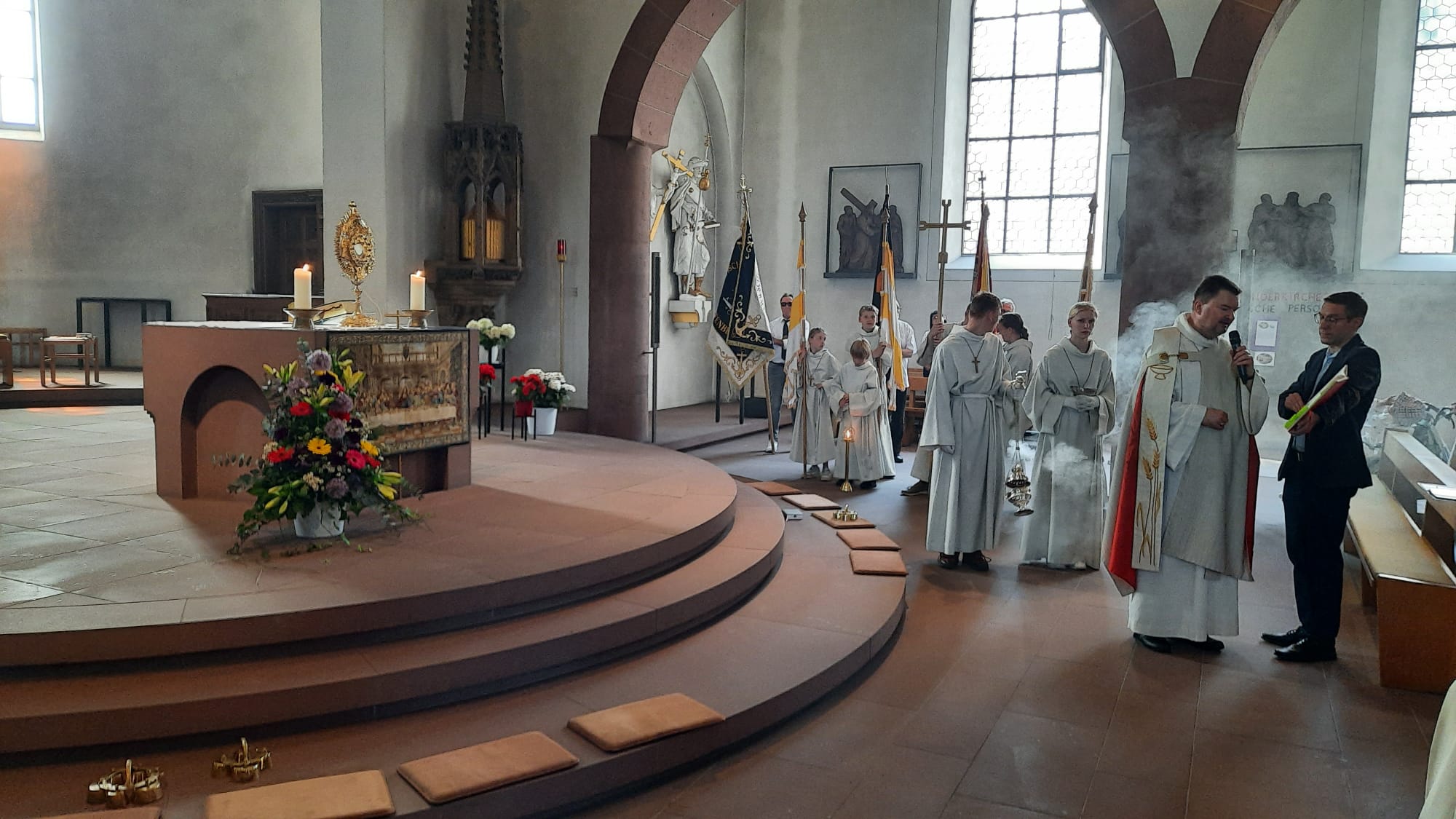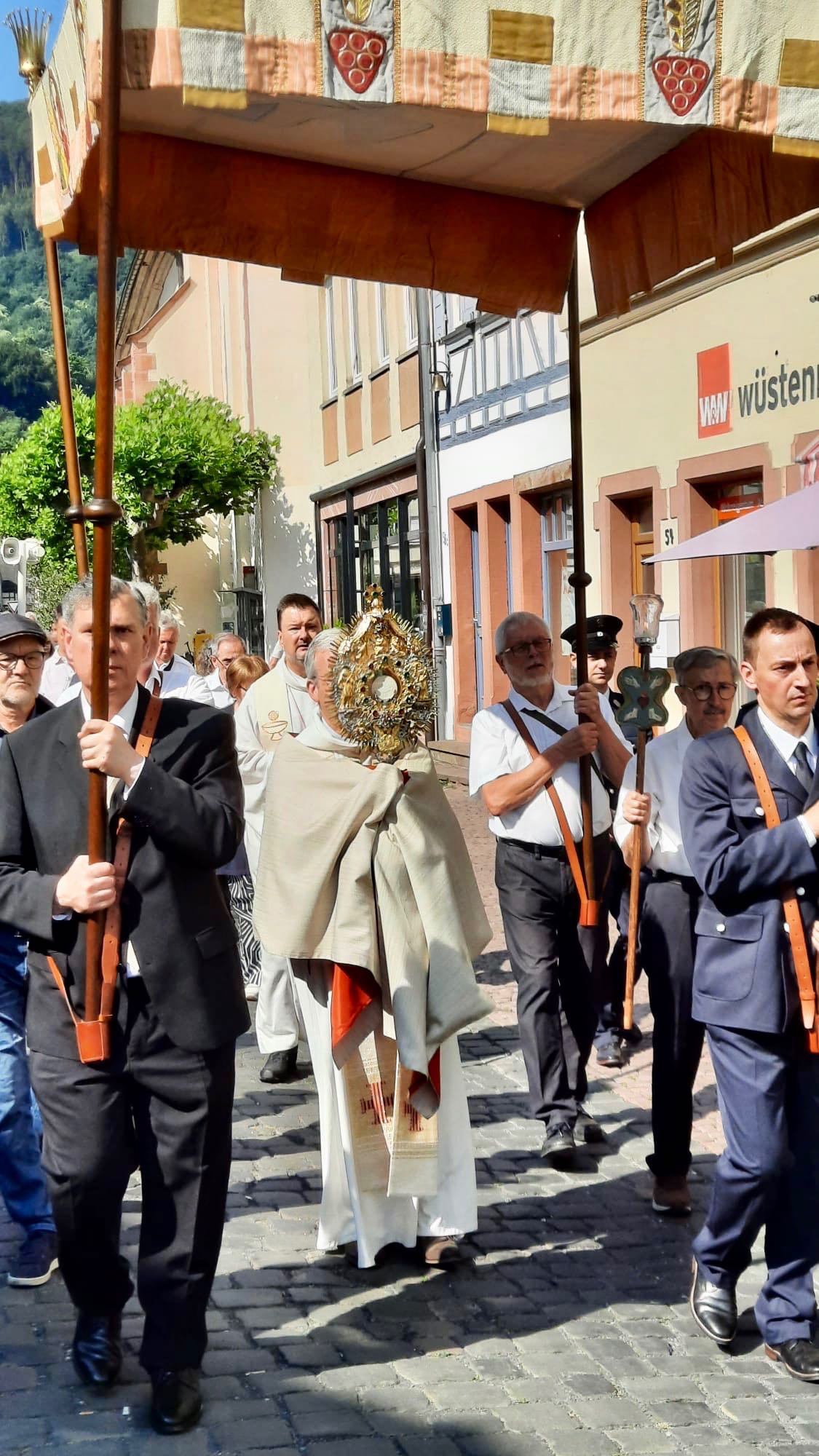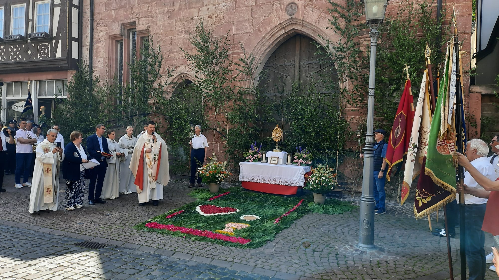 Am 1. Altar am Rathaus stellte Pfarrer Kölbel heraus, dass in den Fürbitten besonders für alle, die für die Stadt Verantwortung hätten, aber auch für die Mitarbeiter der Caritas, die sich für Menschen in Notlagen einsetzten sowie für eine gute Ökumene gebetet werde. Außerdem verkündete der Pfarrer das Evangelium und das „Tantum Ergo“ wurde gesungen. Das Allerheiligste in der Monstranz wurde verehrt und der Pfarrer erteilte den eucharistischen Segen, bevor die Prozession zum 2. Altar am Seniorenheim Maria Regina weiterzog.