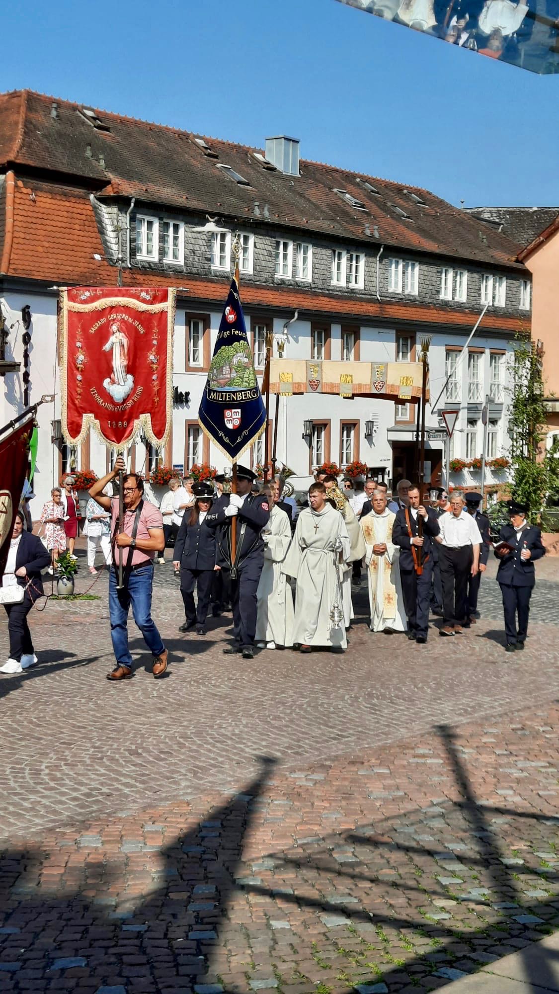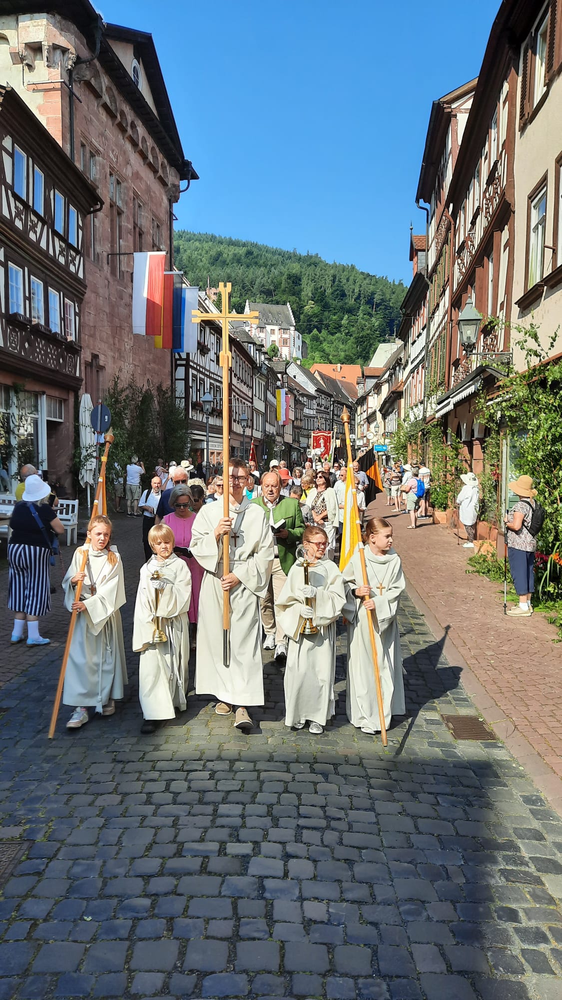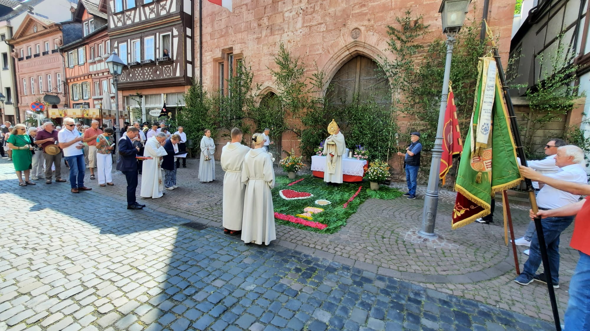 Der Prozessionsweg führte durch die Altstadt von Miltenberg und damit an zahlreichen Orten des täglichen Lebens vorbei. Darin und in den Texten und Gebeten wurde deutlich, dass Gott uns Menschen stets auf all unseren Wegen begleiten möchte, wenn wir ihn in unser Leben einlassen und nicht vergessen, ihn um seinen Beistand zu bitten, aber ihm auch dafür zu danken.