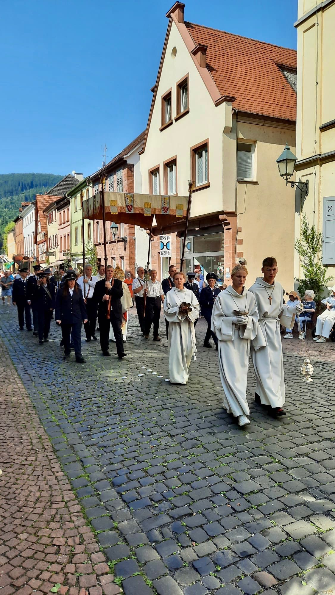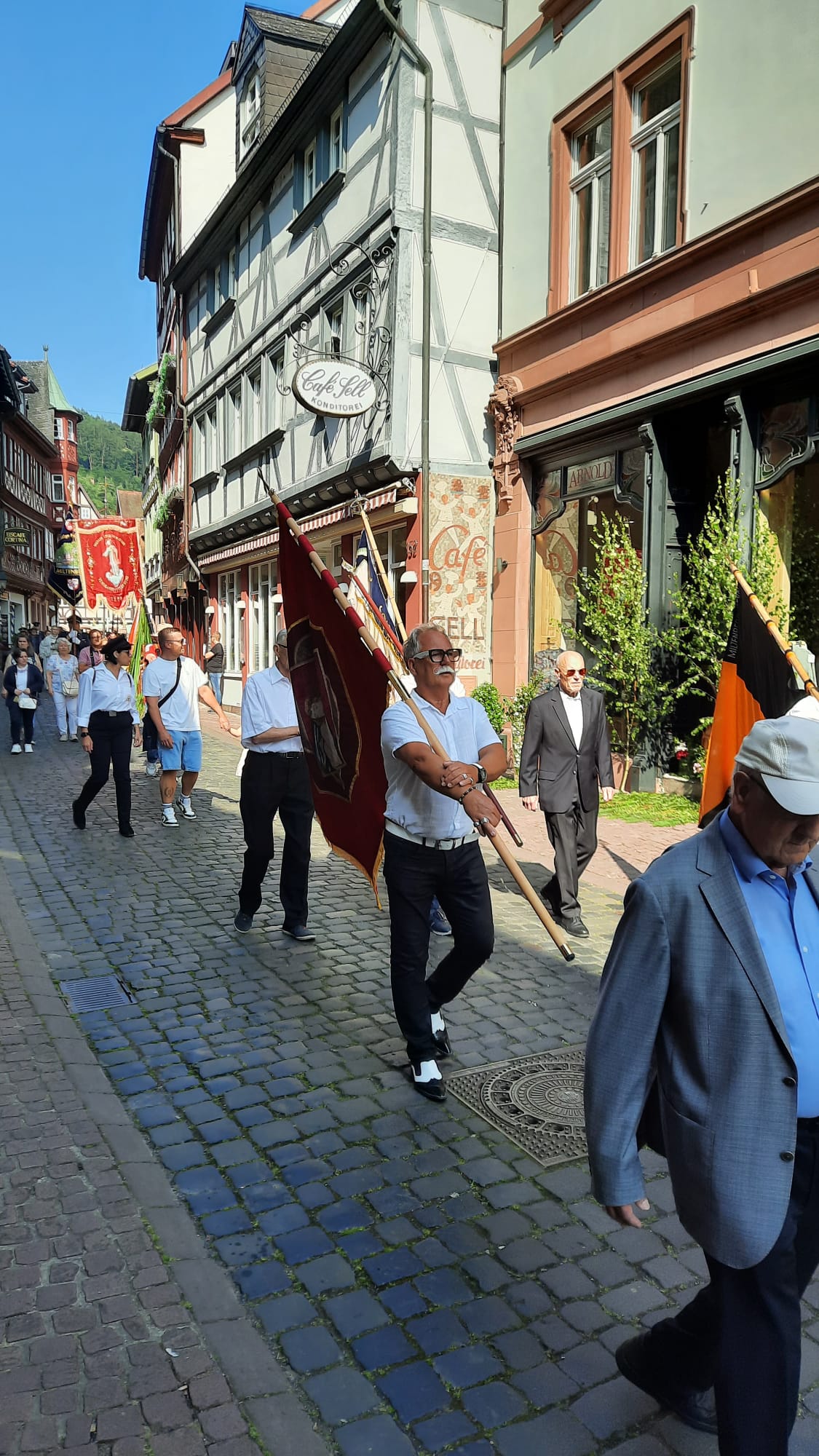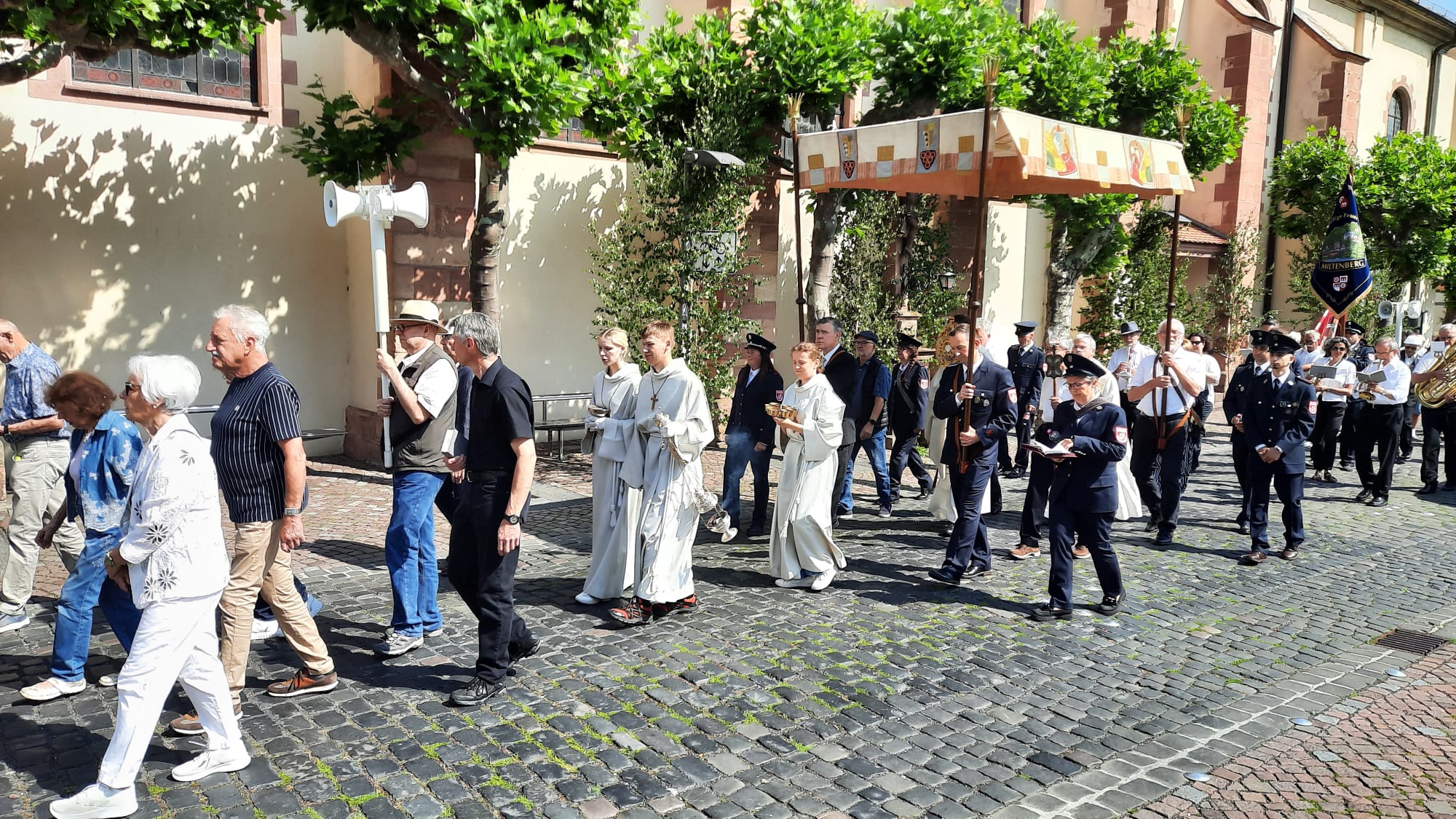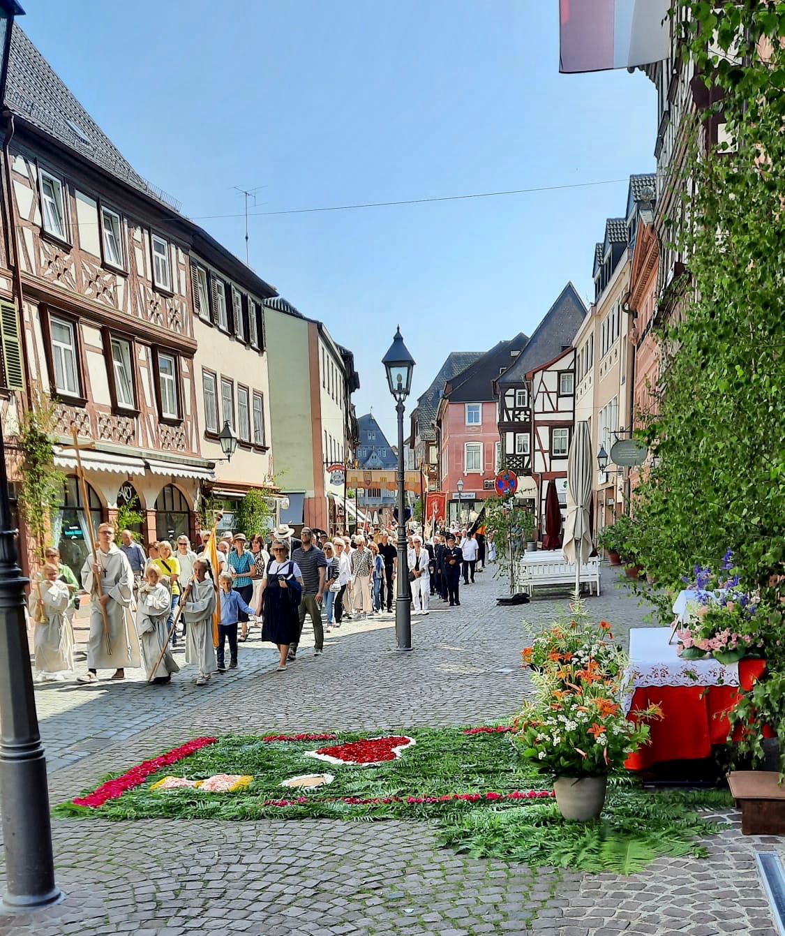 Der Prozessionsweg führte durch die Altstadt von Miltenberg und damit an zahlreichen Orten des täglichen Lebens vorbei. Darin und in den Texten und Gebeten wurde deutlich, dass Gott uns Menschen stets auf all unseren Wegen begleiten möchte, wenn wir ihn in unser Leben einlassen und nicht vergessen, ihn um seinen Beistand zu bitten, aber ihm auch dafür zu danken.