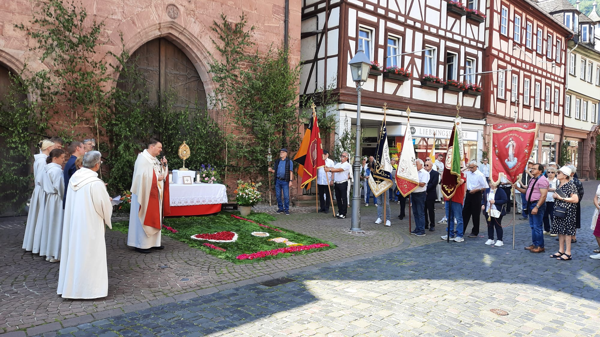 Hier werde besonders für all jene, für die die alte Stadt mehr als eine schöne Kulisse sei, gebetet – also für die Geschäftsleute, die Miltenberg lebenswert machten, für die Menschen, die sich in Vereinen und Verbänden engagierten sowie für die Mitarbeiter der Blaulichtorganisationen, die durch ihren Einsatz dafür sorgten, dass das Leben für die Menschen in unserer Stadt sicher sei. Nach dem Evangelium wurde das Allerheiligste in der Monstranz verehrt und Pfarrer Kölbel erteilte den eucharistischen Segen.
