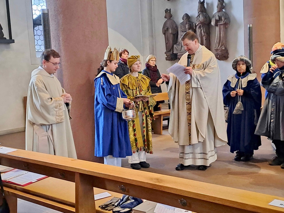 „Schule statt Fabrik – Sternsingen gegen Kinderarbeit“ sei das diesjährige Motto, so Diakon Florian Grimm. Kinder litten besonders unter Ungerechtigkeit, Ausbeutung und Armut. Deshalb sei es gut und wichtig, heute auf Kinder in der ganzen Welt zu schauen. Am Fest der Erscheinung des Herrn stehe auch ein kleines Kind, in Armut geboren, im Mittelpunkt. Für die Weisen, von denen wir im Evangelium hörten, habe sich dieses Kind am anderen Ende der Welt befunden. Dennoch sei für sie kein Weg zu weit gewesen, um zu ihm zu gelangen. Sie seien dem Stern gefolgt und an der Krippe angekommen – bei dem kleinen Jesuskind, das die Welt verändert habe.
