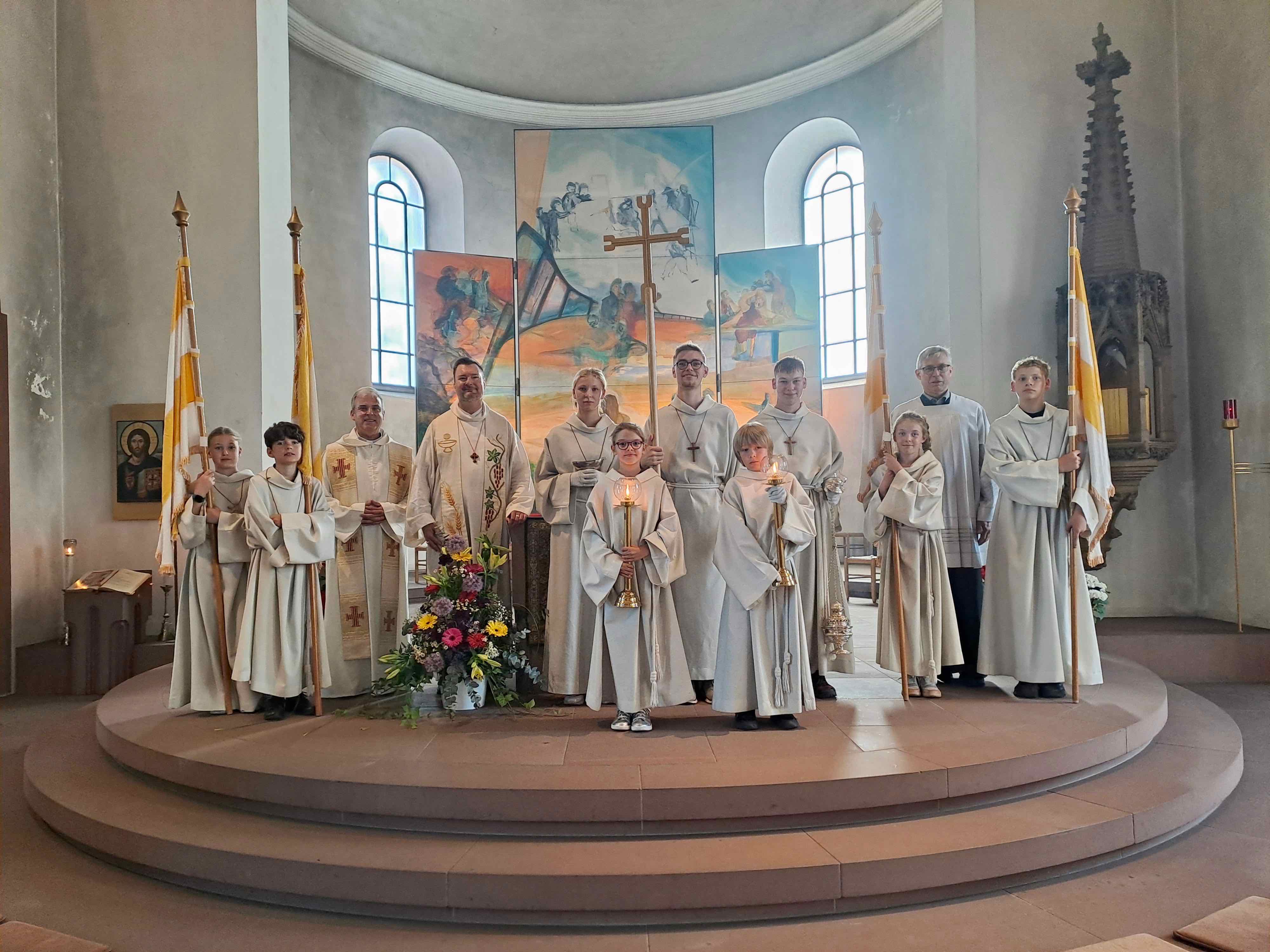 Wenn wir heute an Fronleichnam den Himmel auf Erden feierten, dann zeigten wir, dass es auch anders gehe. Hierdurch setzten wir ein Zeichen für Glaube, Liebe, Frieden und Barmherzigkeit. Ein Zeichen jedoch genüge nicht; diese Haltung solle sich auch in unserem Leben widerspiegeln. Der Tragehimmel habe noch eine andere Bedeutung. Er erinnere an das Bundeszelt des alten Israel und damit daran, dass Gott mit seinem Volke mitgezogen sei. Das II. Vatikan. Konzil habe das Bild vom „Volk Gottes unterwegs“ geprägt. Bis heute sei die Kirche immer unterwegs, z.B. in den Bittprozessionen und Flurgängen vor Christi Himmelfahrt, an Fronleichnam oder in der Wallfahrtssaison – aktuell nach Walldürn oder im August nach Dettelbach.
