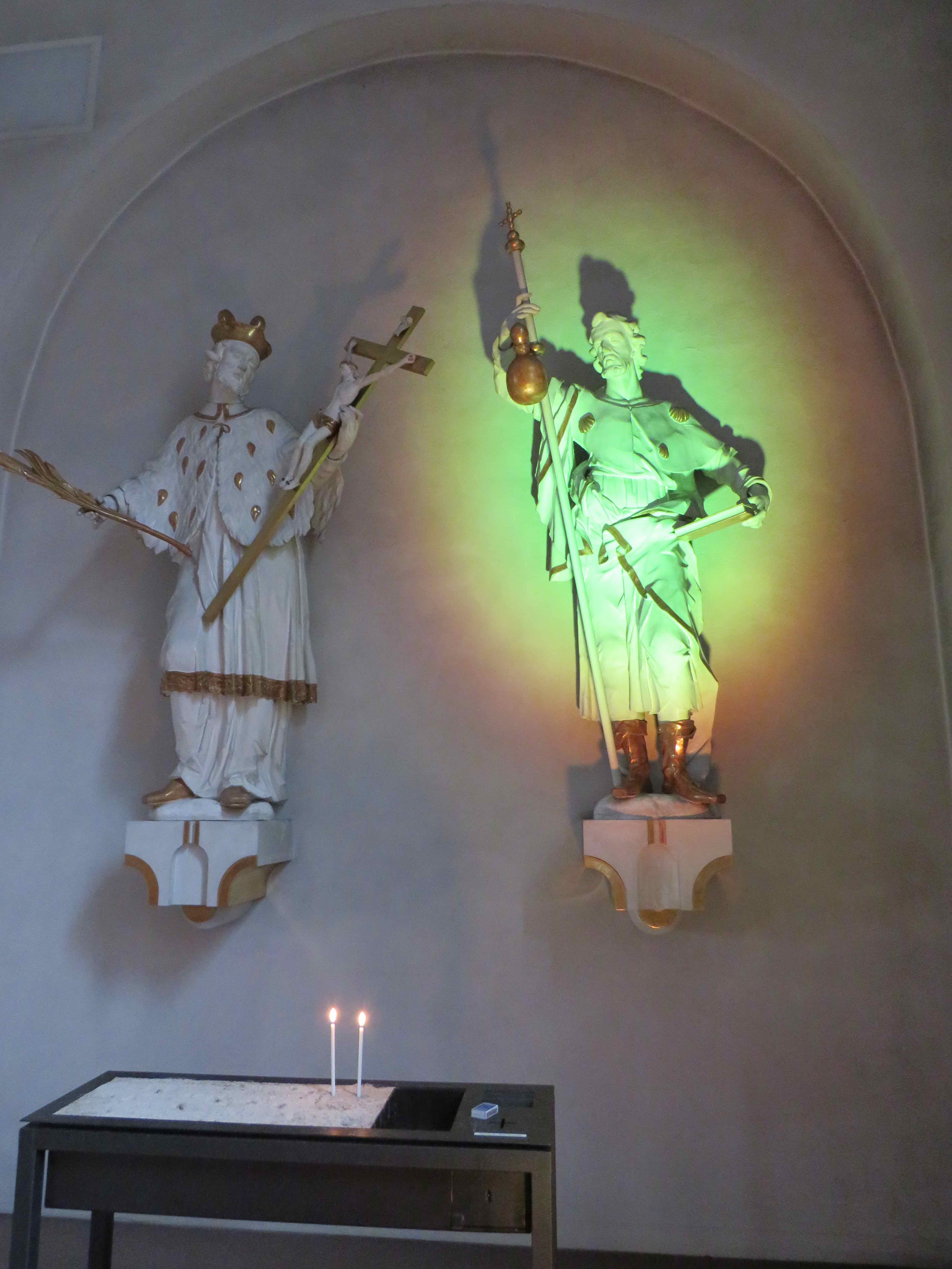 Diese Steine stammten von Orten, die mit dem Hl. Jakobus in Verbindung stünden. Ganz rechts hinten sei ein Stein vom See Genesareth, also von dem Ort, an dem Jesus die beiden Brüder Jakobus und Johannes in seine Nachfolge gerufen habe. Bald schon hätten sie mit Simon Petrus zum allerengsten Kreis um Jesus gehört. Deshalb habe Jesus sie auch auf den Berg der Verklärung, den Berg Tabor mitgenommen. Von dort sei der zweite Stein.