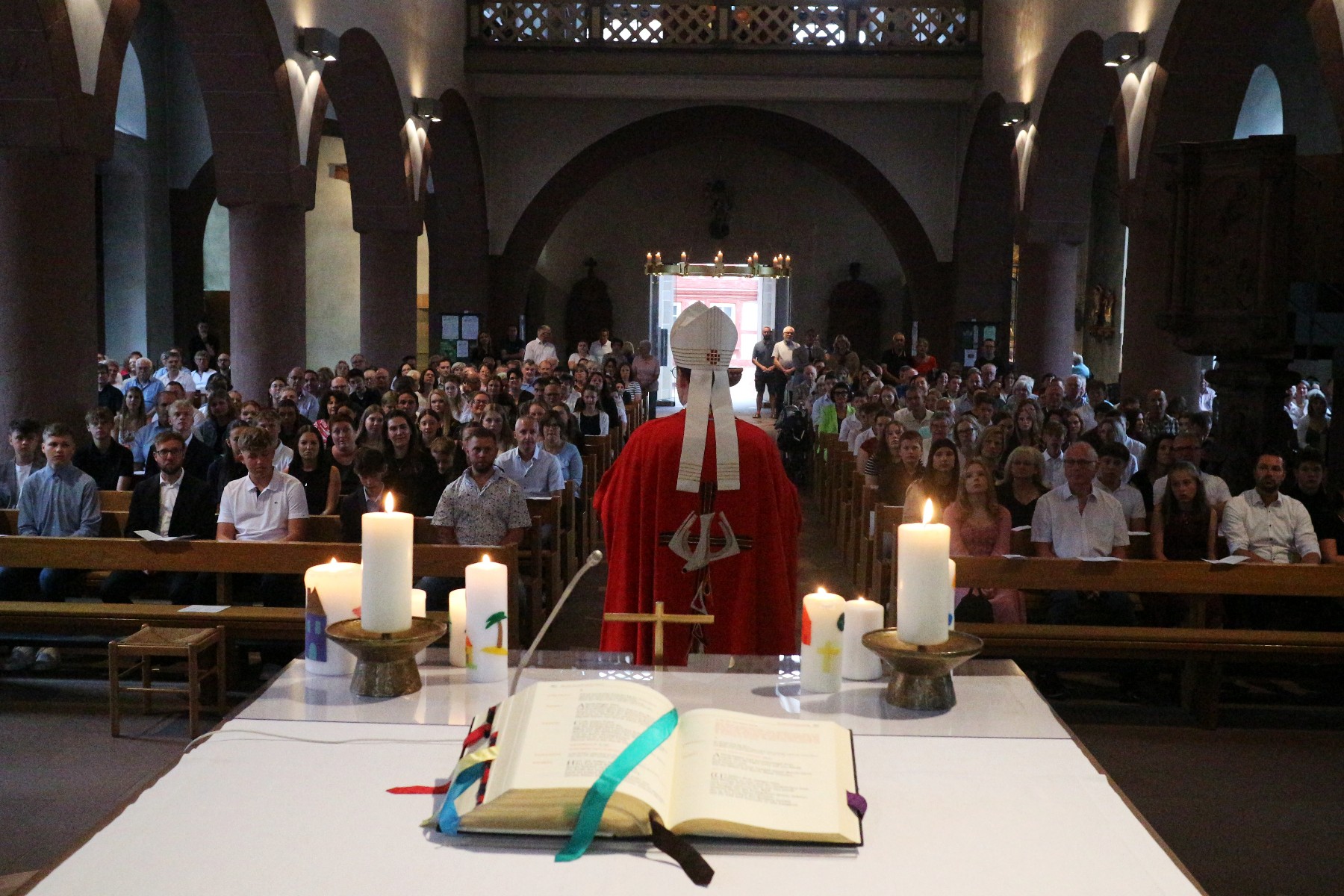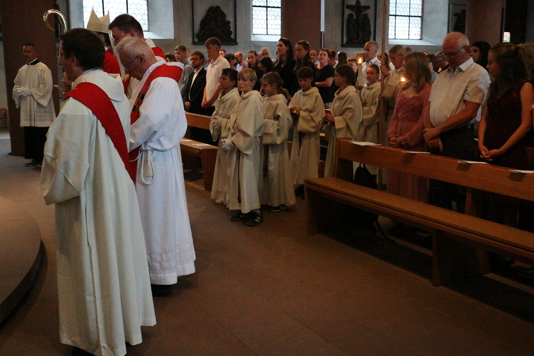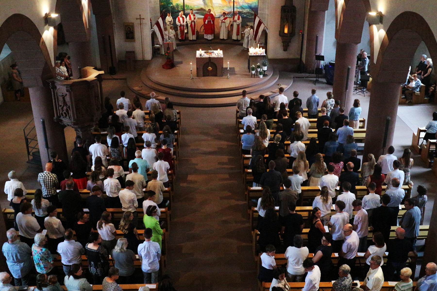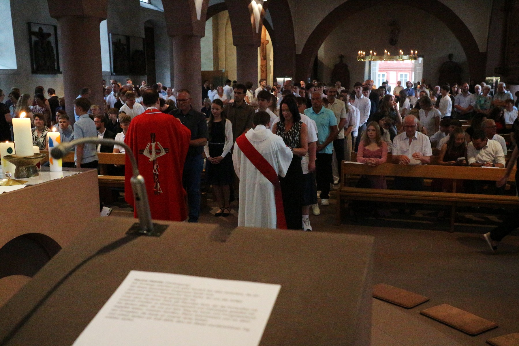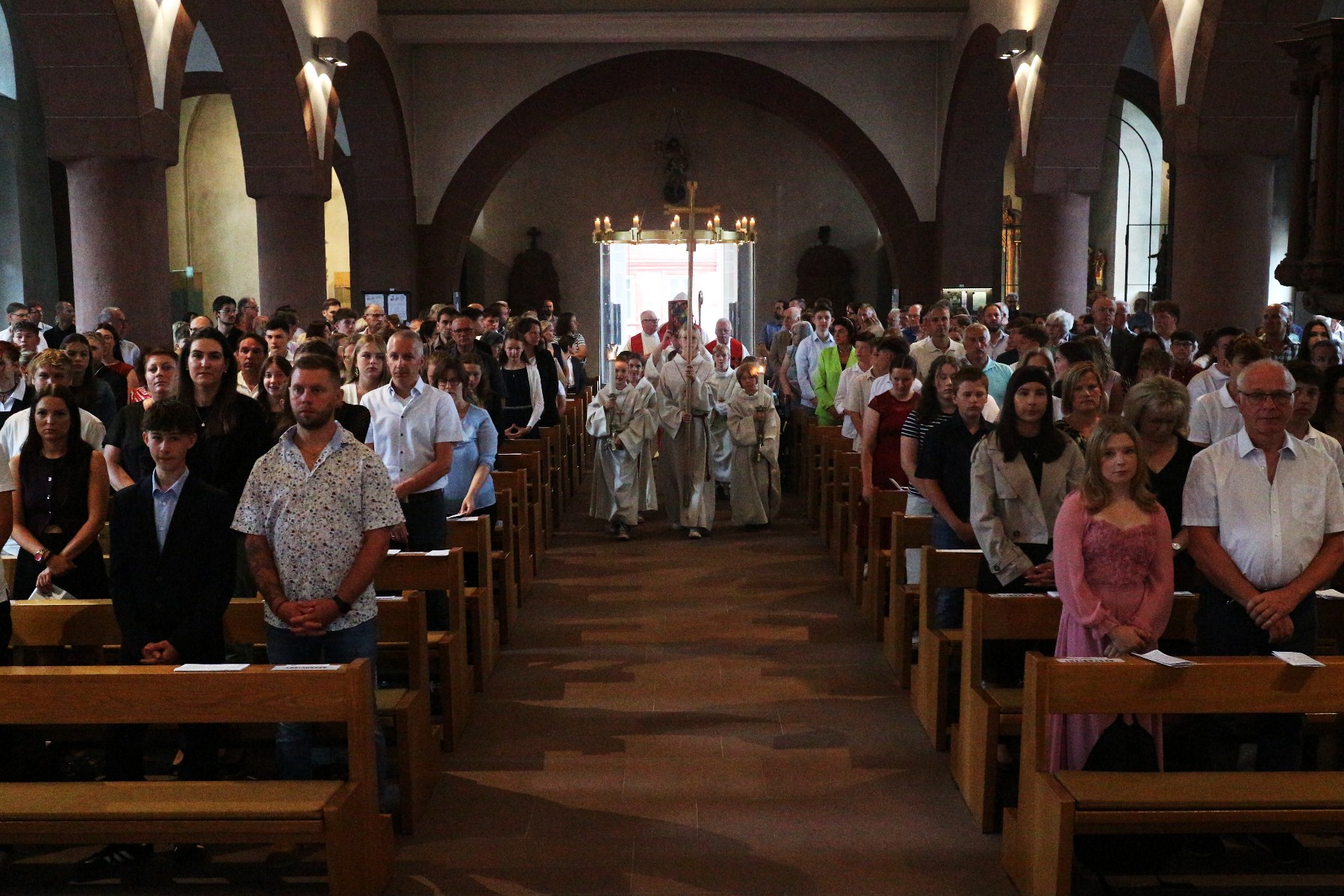 Zum Gottesdienst haben sich die Firmlinge aus den Pfarreiengemeinschaften Eichenbühl und Miltenberg/Bürgstadt am Freitag, den 27.06.25 versammelt. Unterstützung erhielten sie von ihren Familienangehörigen, Freunden und Bekannten. Nachdem Pfarrer Jan Kölbel Weihbischof Paul im Namen aller begrüßte, begann die Messfeier mit dem Kreuzzeichen. Musikalisch wurde die Feier vom Gesang der Gemeinde, der Band „Terikto“ und Organist Markus Heinrich getragen. In der Predigt ermutigte Weihbischof Paul die Firmlinge auf ihrem Lebensweg einmal zu einem „echten Original“ zu werden. Keine Kopie von einem anderen oder das Produkt einer künstlichen Idee. Gott schenkt ihnen seinen Heiligen Geist, seine Vertrauenskraft, damit sie JA sagen können: Zu sich selber, zum Leben und zum Glauben. Eingangs fragte Weihbischof Paul, ob die Anwesenden wohl nach dem Gottesdienst „belebt“ zum Alltag zurückkehren würden. Die Antwort kann mit einem kräftigen JA beantwortet werden. Den Firmlingen wünschen wir stets ein lebendiges JA zu ihrem Leben! Vielen Dank allen für die Unterstützung unserer jungen Mitchristen auf ihrem bisherigen Werg und für die Begleitung in der kommenden Zeit. Herzliches Vergelt’s Gott den Messnern, der Lektorin und den Ministranten für ihren Dienst. Möge die Freude der Firmlinge lange anhalten. Hier die Fürbitten der Firmlinge während der Messfeier. (Fotos: u.a. Thomas Bertlwieser)