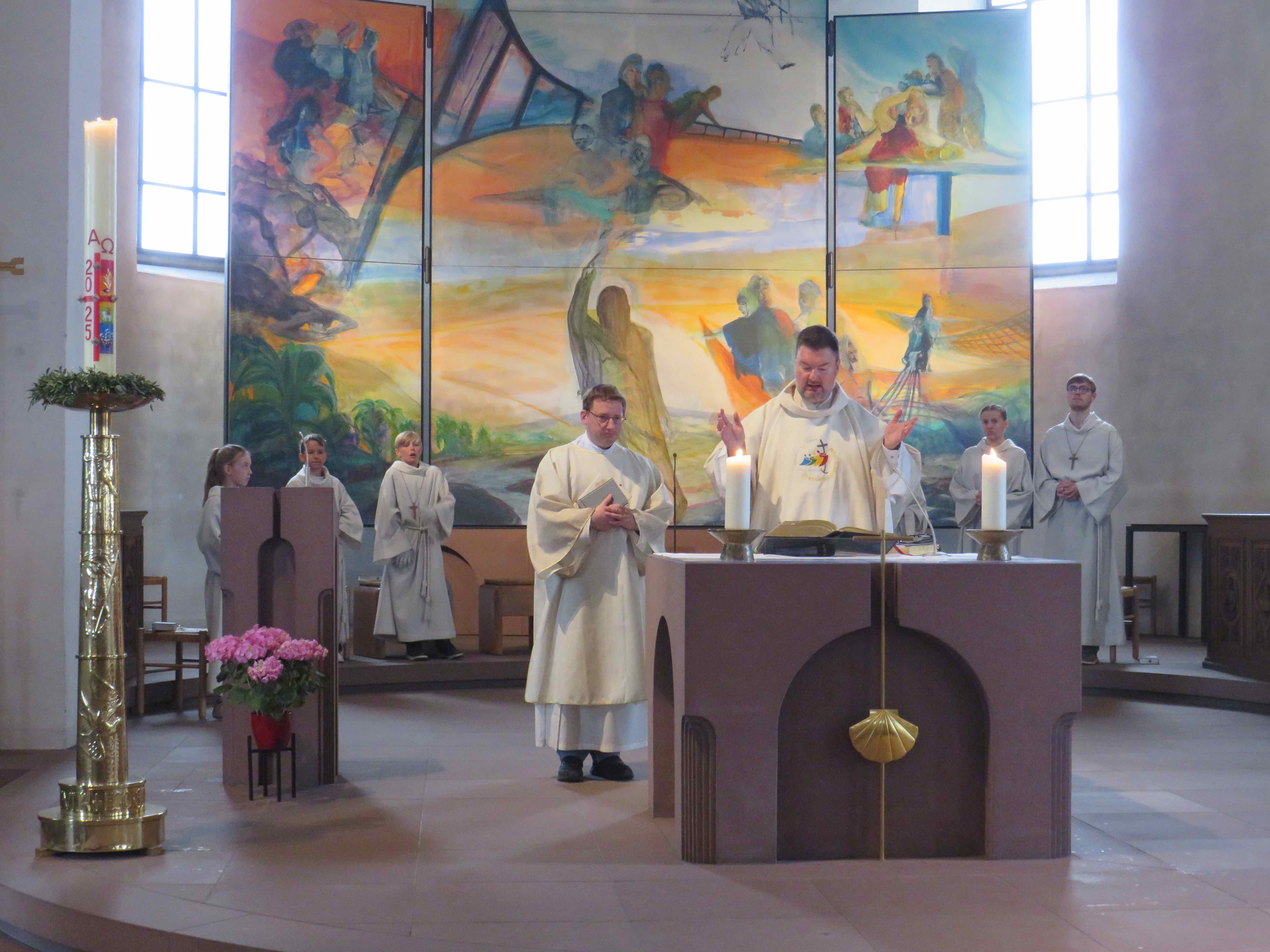In seiner Predigt ging Diakon Florian Grimm auf die Wahl des Papstes am 7. und 8. Mai 2025 in Rom ein. An diesen beiden Tagen habe die ganze Welt auf einen mehr oder weniger schönen Kamin geblickt und gespannt auf das Aufsteigen von weißem Rauch gewartet. An sich sei es ein schönes Zeichen der Einheit, wenn die Kirche in eine Richtung blicke – ob dies allerdings ein Kamin sein müsse, könne dahingestellt bleiben.