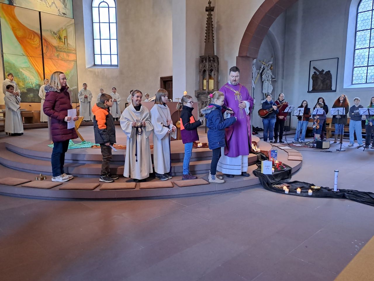 Nun stellten sich die Kommunionkinder mit Namen und Wohnort der Gemeinde vor. Jedes Kind erhielt eine Becherkerze mit seinem Namen darauf, die es im Gottesdienst anzünden und auf dem Altar platzieren darf. Es waren vier Kinder aus Breitendiel, ein Kind aus Mainbullau, vier Kinder aus Wenschdorf und zwölf Kinder aus Miltenberg. Pfarrer Kölbel bat die Gläubigen, die Kommunionkinder ins Gebet einzuschließen und bedankte sich beim Familiengottesdienstteam für die Vorbereitung und musikalische Gestaltung. Das Kirchencafé im Anschluss an den Gottesdienst bot die Gelegenheit, miteinander ins Gespräch zu kommen.