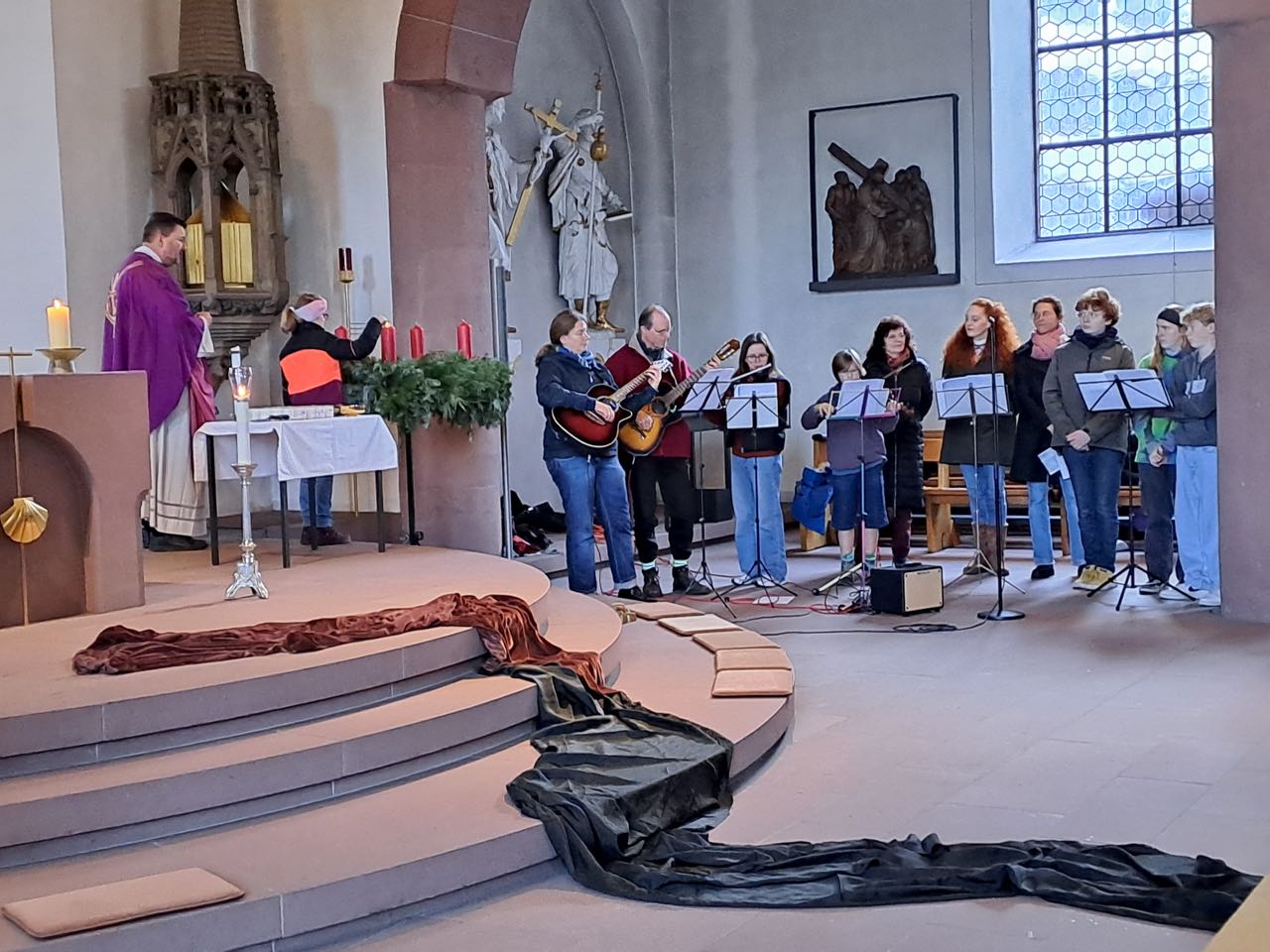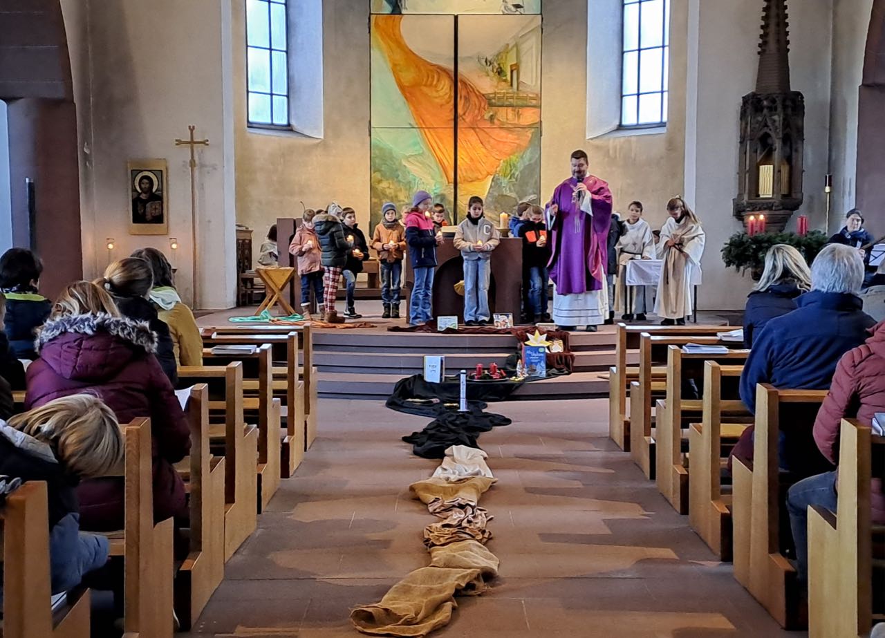 In seiner Predigt fragte er die Erwachsenen, ob sie sich nicht auch freuten, dass die beiden Baustellen auf dem Weg nach Aschaffenburg nun endlich fertig seien. Freie Straßen seien viel wert. Johannes der Täufer habe nicht an den Bau von Straßen gedacht, als er gefordert habe, dem Herrn den Weg zu bereiten. Damit Gott bei uns ankommen könne, müssten wir den Weg zu unseren Herzen frei machen. Um störende Steine und Felsbrocken wegzuräumen, könnten wir den Gottesdienst besuchen, in der Bibel lesen und uns bewusst Zeit für Gott nehmen.