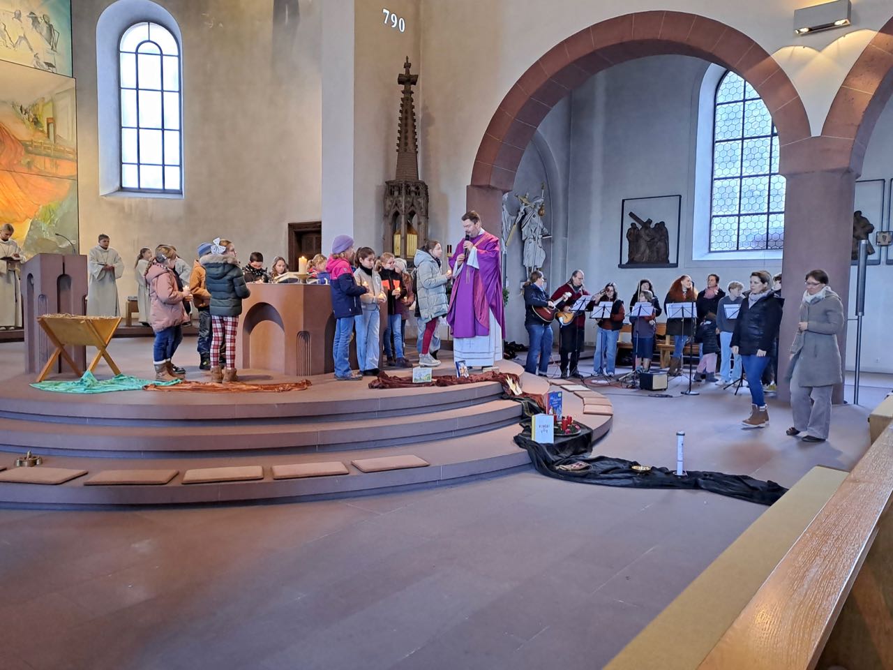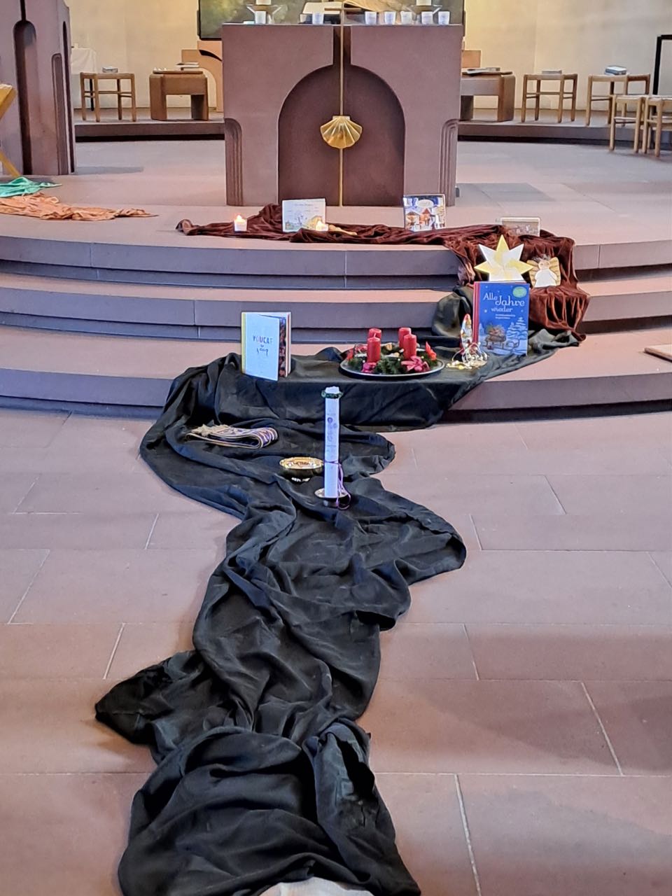 „Ich bastele Sterne“, entgegnete ein Kind. „Wir backen Plätzchen“ oder „ich lese in meinem Adventskalender“ antworteten die Kinder. Auf dem Boden befinde sich ein Weg zum Altar, der bis zur Krippe führe. Das sei unser Weg bis Weihnachten. Darauf wurden ein Adventskranz, Bücher mit Liedern und Geschichten usw. gestellt. Auf diesem Weg sei noch Platz, so der Pfarrer. Die Kommunionkinder hätten noch einen anderen Weg begonnen, darauf käme er später zurück.