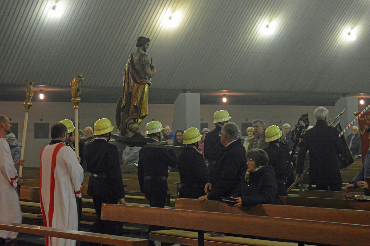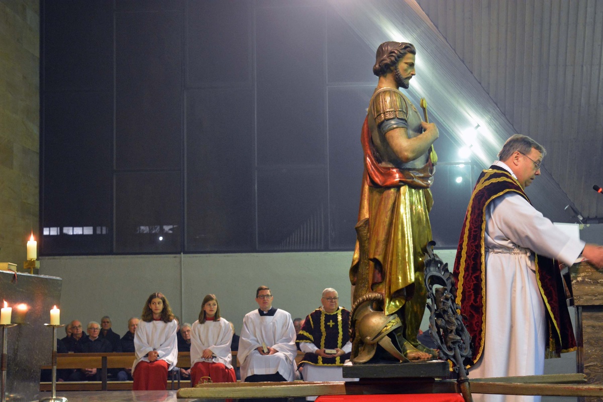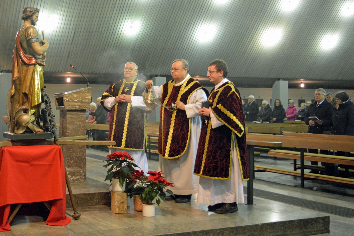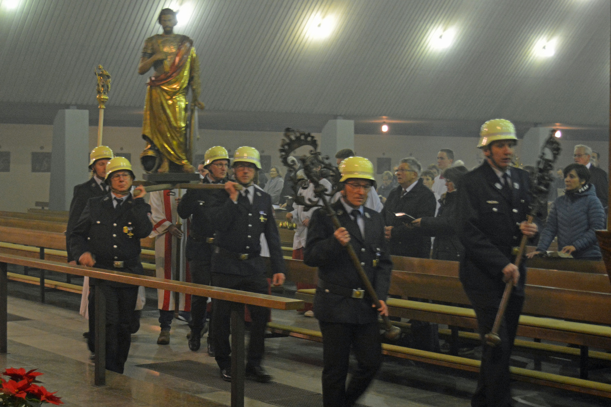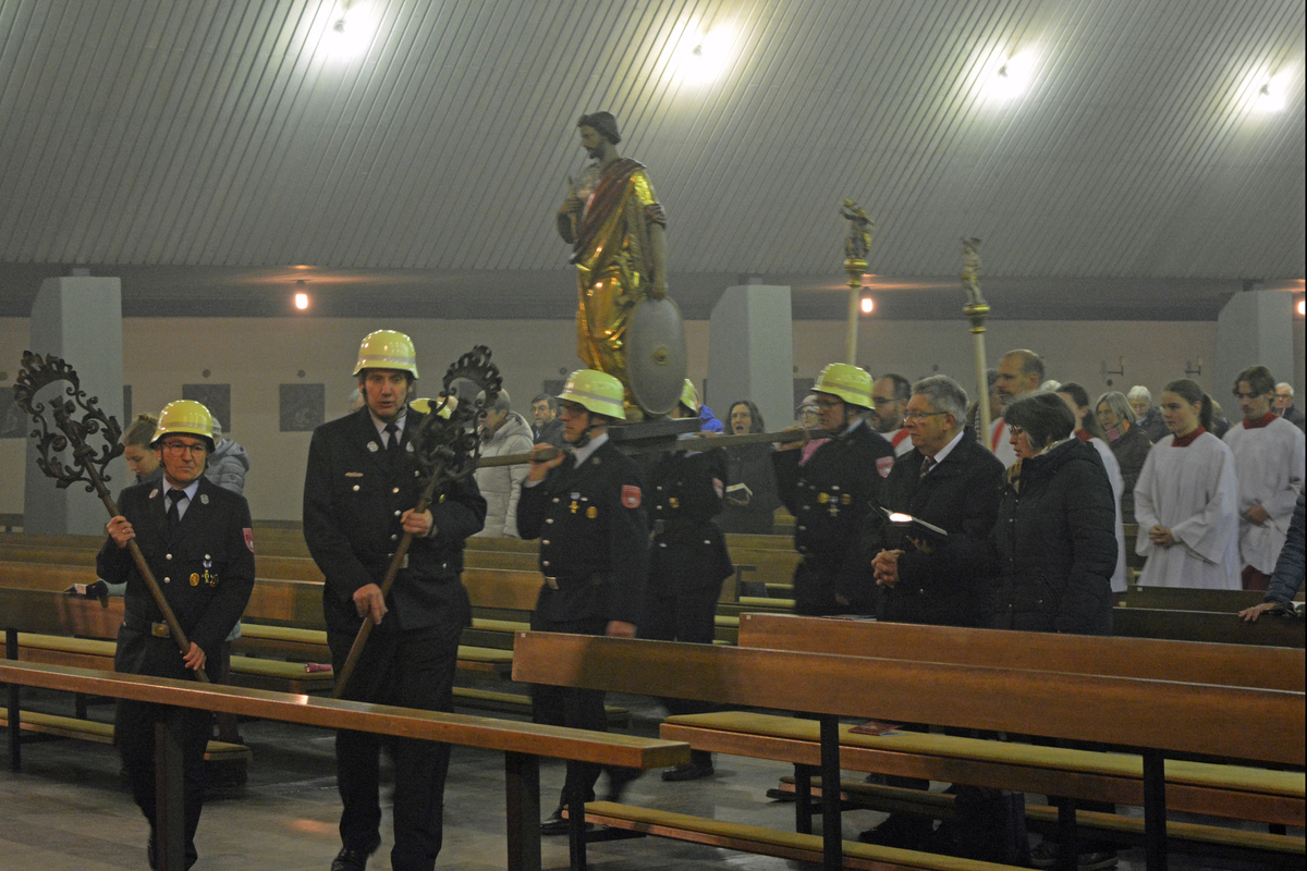 Den Gottesdienst zelebrierte Monsignore Leipold gemeinsam mit den Diakonen Florian Grimm und Friedhelm Bundschuh. Leipold dankte auch den Männern der Freiwilligen Feuerwehr Bürgstadt, die die schwere Sebastianusstatue beim Umgang am Ende des Gottesdienstes durch die Kirche trugen.