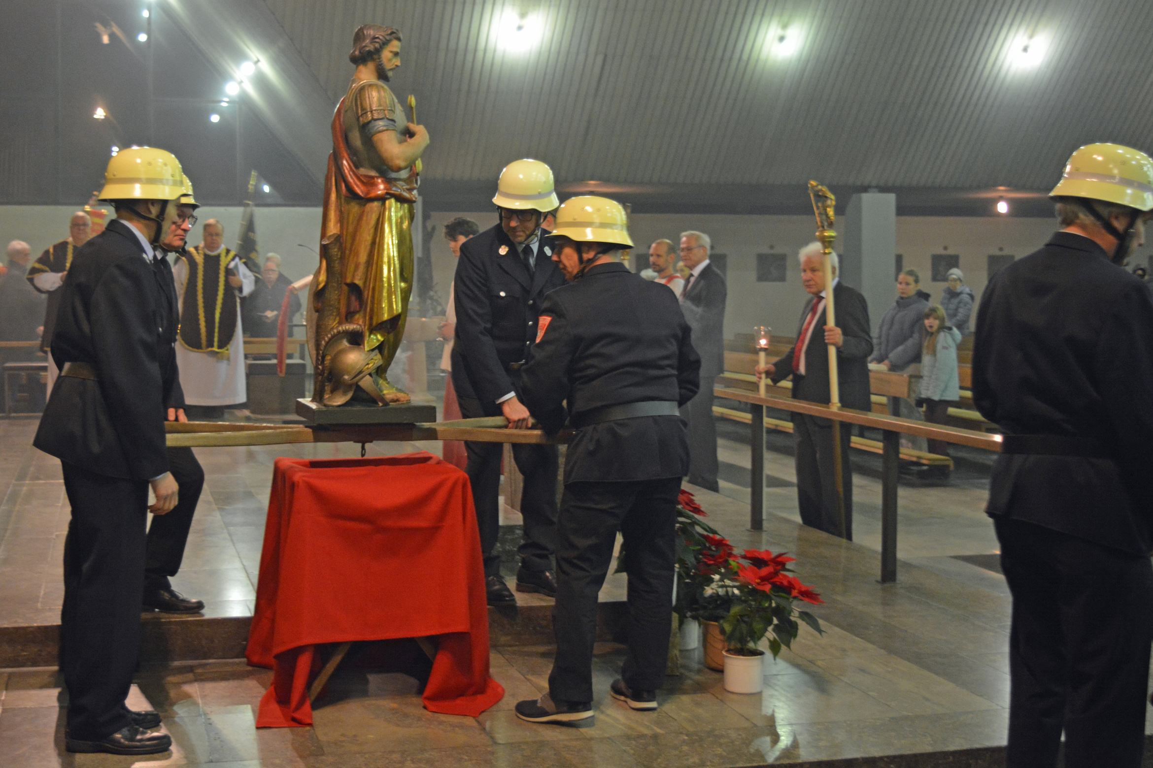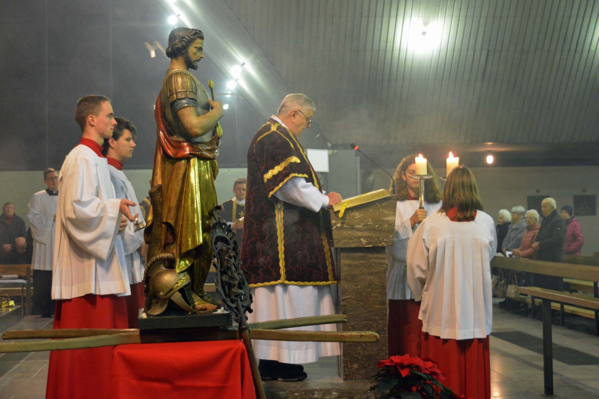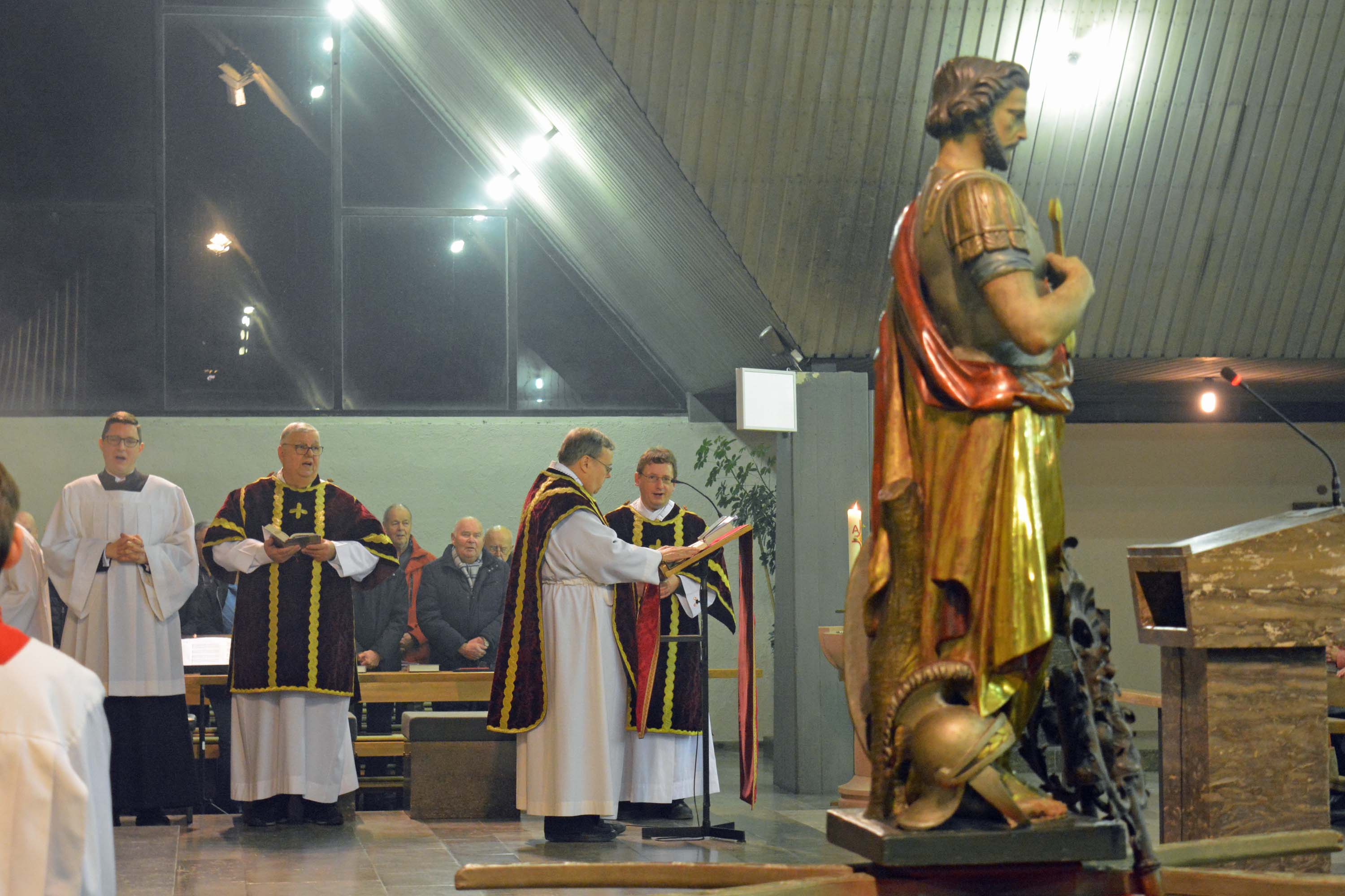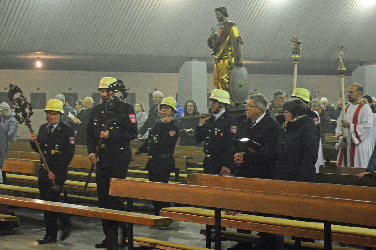 Den Gottesdienst zelebrierte Monsignore Leipold gemeinsam mit den Diakonen Florian Grimm und Friedhelm Bundschuh. Leipold dankte auch den Männern der Freiwilligen Feuerwehr Bürgstadt, die die schwere Sebastianusstatue beim Umgang am Ende des Gottesdienstes durch die Kirche trugen.
