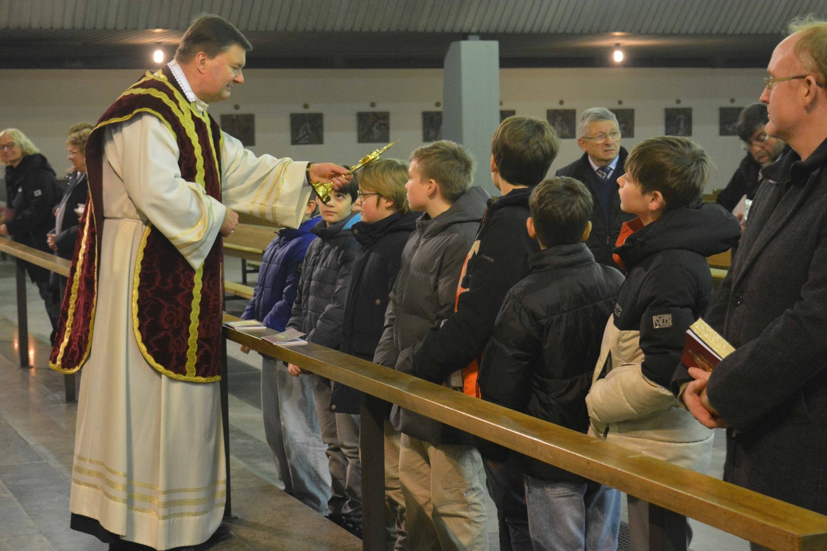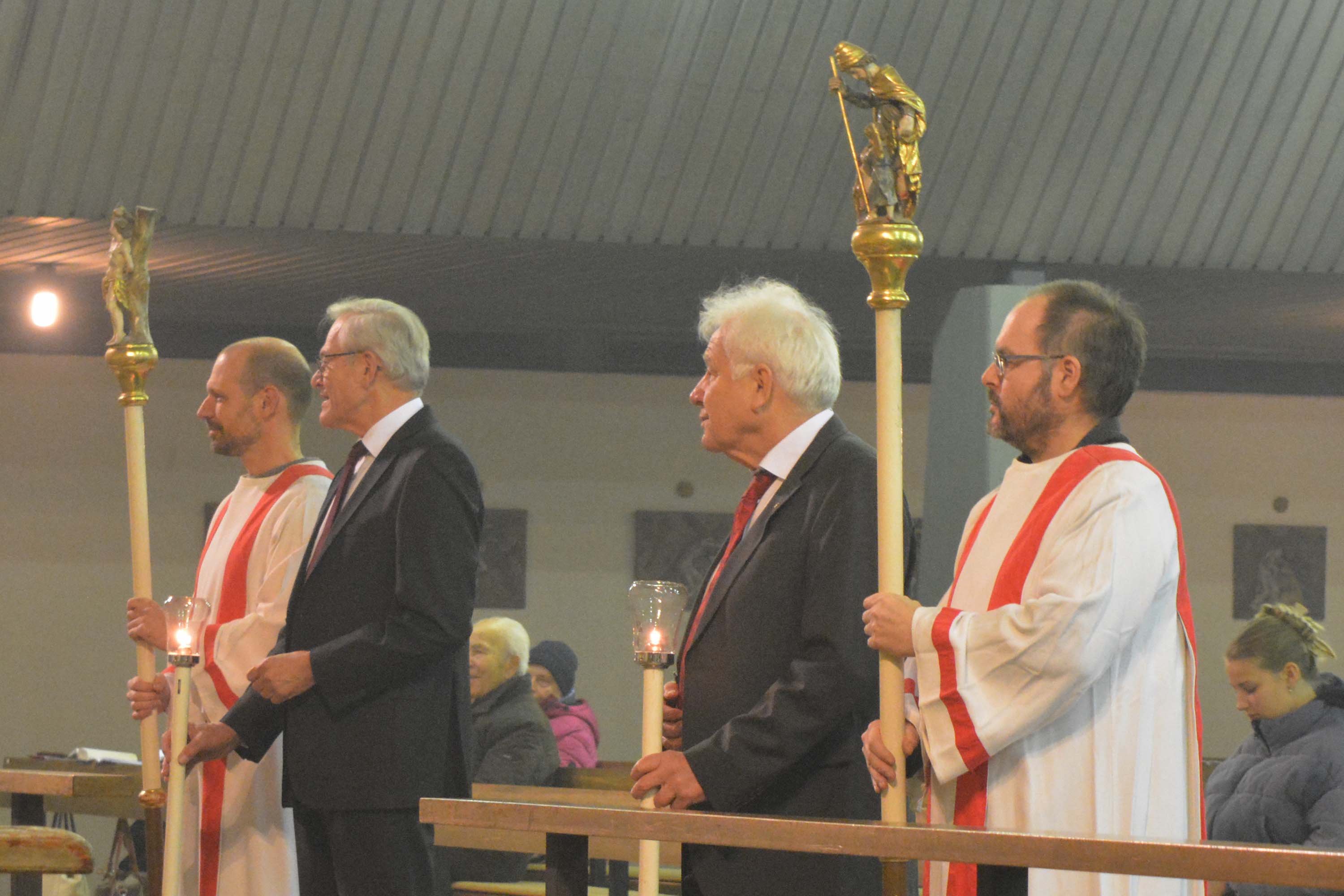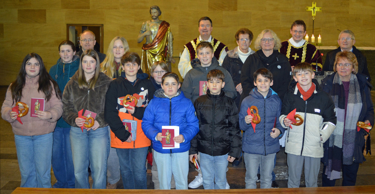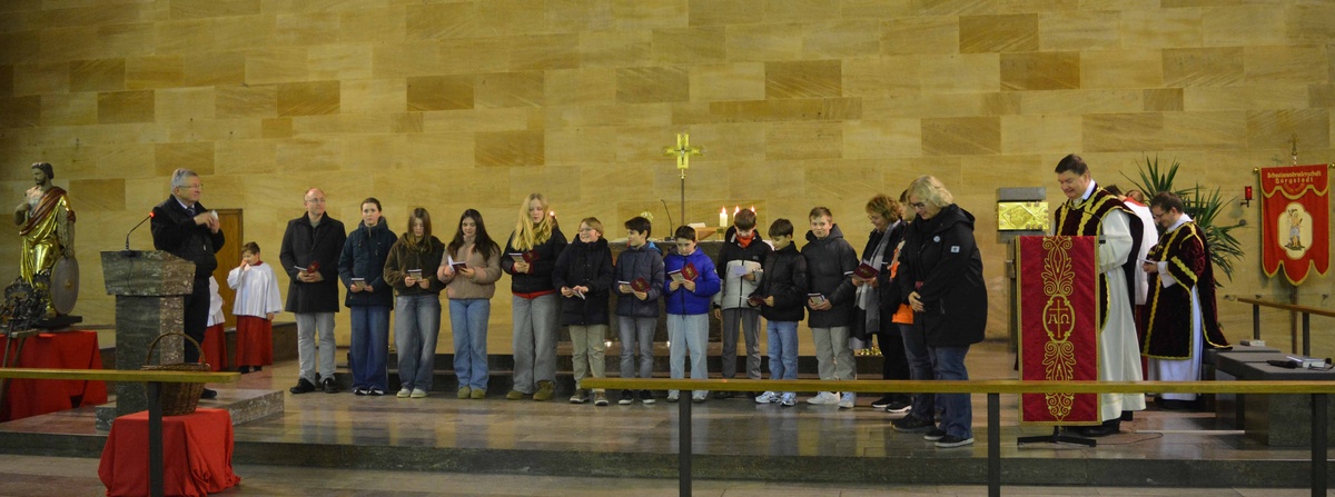 Im Gottesdienst mit Neuaufnahme am Brudermontag, 19.01.26 begrüßte Pfarrer Kölbel die Mitglieder der Bruderschaft, und besonders auch die 10 Jugendlichen und 4 Erwachsenen die an diesem Abend neu aufgenommen wurden. Er erinnerte voll Dankbarkeit an den Heiligen Sebastian, dessen Gedenktag am 20. Januar gefeiert wird. Er erinnerte auch dankbar an die 511 Jahre lange Tradition, an die unglaublich vielen Mitglieder, die uns im Glauben vorausgegangen sind. Wenn wir feiern, sind nicht nur wir hier, diese Messe feiern auch alle Verstorbenen der Bruderschaft mit uns, sie gehören immer noch zur Bruderschaft. Das ist ja auch der Sinn der Bruderschaft, dass sie eine Gebetsgemeinschaft ist, die noch weit über das irdische Leben hinaus reicht, das ist das schöne daran, dass einen die Gemeinschaft nicht vergisst, auch wenn sich sonst niemand mehr an einen erinnert. Wir können an diese Gemeinschaft glauben, weil Jesus Christus uns versprochen hat, dass wir mit ihm eine Gemeinschaft haben, die unzerstörbar ist. Das Gedenken der Verstobenen des vergangen Jahres war auch im Mittelpunkt der Festandacht am Sonntag, 18.01.26 um 17.00 Uhr gestanden. Wie üblich wurden die Namen der Verstorbenen in Bürgstadt, aber auch auswärts von Brudermeister Michael Schmitt vorgetragen. Dass auch Sterbefälle z.B. in USA gemeldet werden und auch an lange ausgereiste Mitglieder noch gedacht wird, gab er den neu aufgenommen Mitgliedern mit auf den Weg.