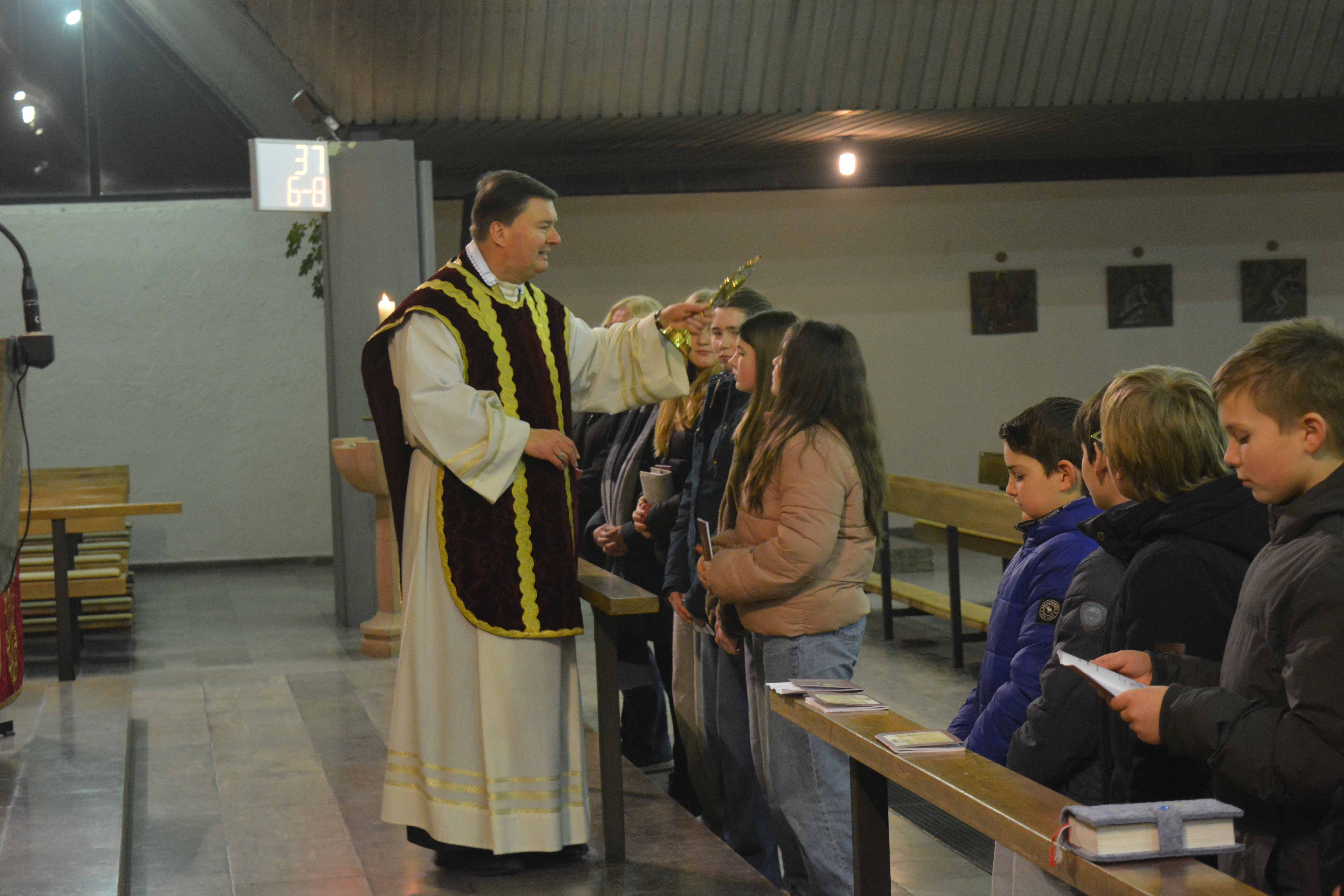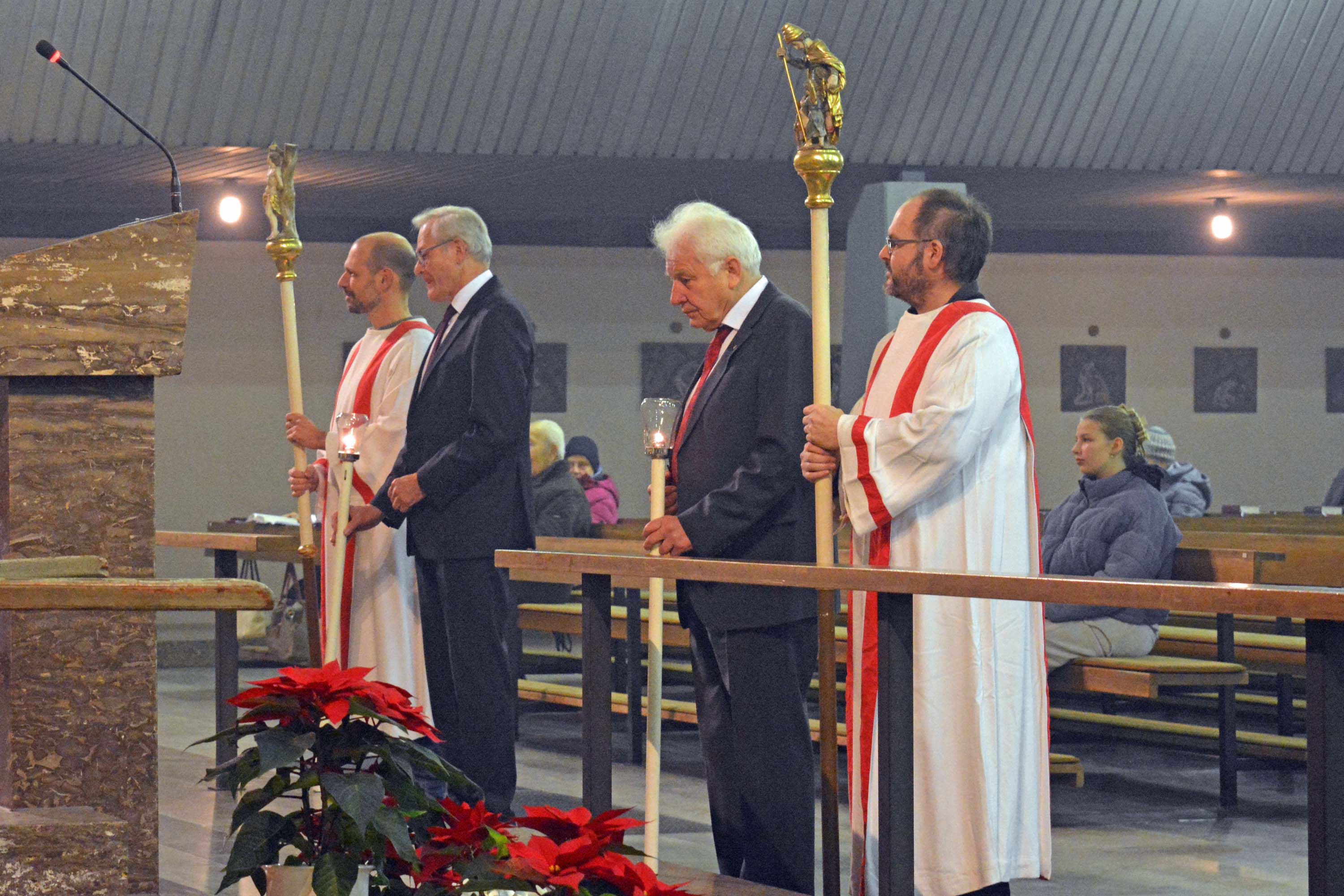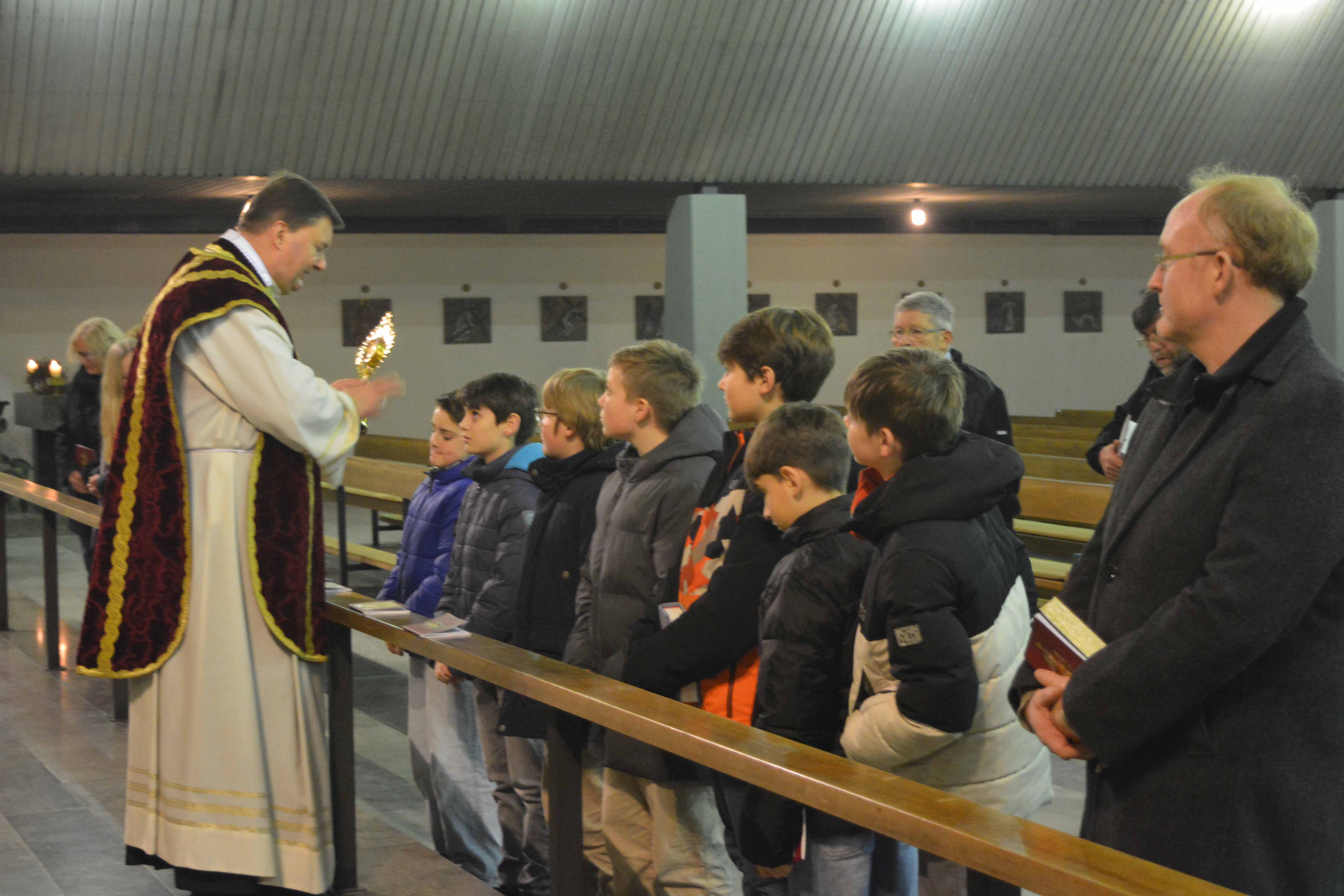 Im Gottesdienst mit Neuaufnahme am Brudermontag, 19.01.26 begrüßte Pfarrer Kölbel die Mitglieder der Bruderschaft, und besonders auch die 10 Jugendlichen und 4 Erwachsenen die an diesem Abend neu aufgenommen wurden. Er erinnerte voll Dankbarkeit an den Heiligen Sebastian, dessen Gedenktag am 20. Januar gefeiert wird. Er erinnerte auch dankbar an die 511 Jahre lange Tradition, an die unglaublich vielen Mitglieder, die uns im Glauben vorausgegangen sind. Wenn wir feiern, sind nicht nur wir hier, diese Messe feiern auch alle Verstorbenen der Bruderschaft mit uns, sie gehören immer noch zur Bruderschaft. Das ist ja auch der Sinn der Bruderschaft, dass sie eine Gebetsgemeinschaft ist, die noch weit über das irdische Leben hinaus reicht, das ist das schöne daran, dass einen die Gemeinschaft nicht vergisst, auch wenn sich sonst niemand mehr an einen erinnert. Wir können an diese Gemeinschaft glauben, weil Jesus Christus uns versprochen hat, dass wir mit ihm eine Gemeinschaft haben, die unzerstörbar ist. Das Gedenken der Verstobenen des vergangen Jahres war auch im Mittelpunkt der Festandacht am Sonntag, 18.01.26 um 17.00 Uhr gestanden. Wie üblich wurden die Namen der Verstorbenen in Bürgstadt, aber auch auswärts von Brudermeister Michael Schmitt vorgetragen. Dass auch Sterbefälle z.B. in USA gemeldet werden und auch an lange ausgereiste Mitglieder noch gedacht wird, gab er den neu aufgenommen Mitgliedern mit auf den Weg.