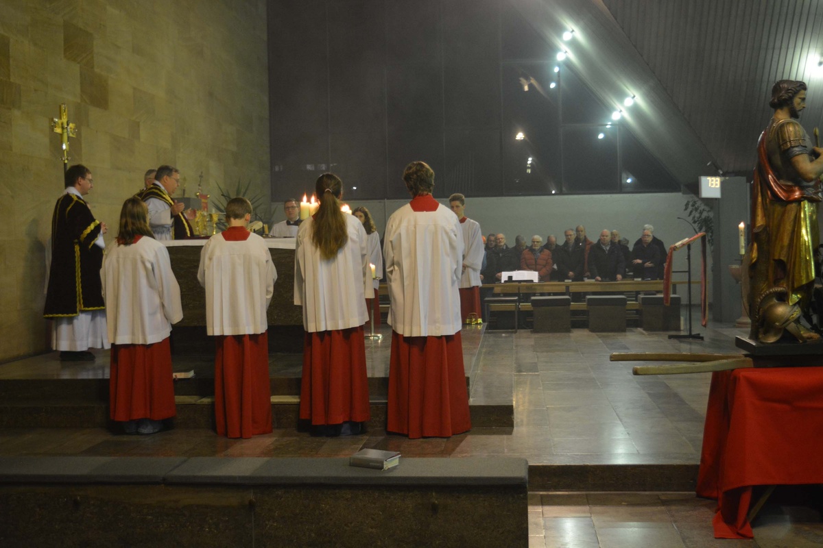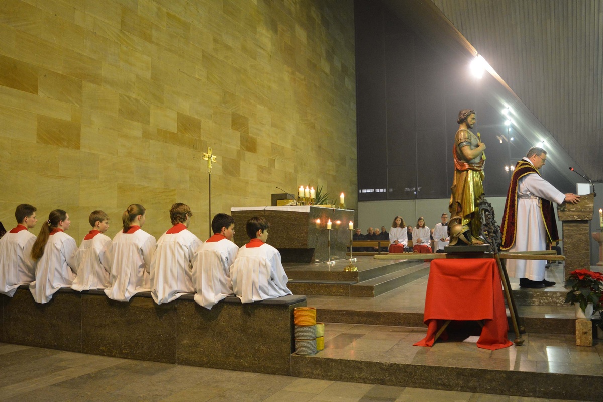Er freute sich über die vielen Ministranten, begrüßte besonders den Männerchor, der in Jubiläumsjahr des Gesangsvereins den Gottesdienst musikalisch mitgestaltete. In seiner Ansprache stellte er fest, dass wir in unsicheren Zeiten leben. Der lange Zeit als zuverlässig angesehe Schutz durch die USA wird fragil, bei Rente, Pflege und Krankenkassen, in unseren wichtigen Versorgungssystemen haben wir jede Menge Unsicherheiten. In solchen Situationen denkt man gerne an die "gute alte Zeit" zurück. Aber auch im Jahr 1515, im Gründungsjahr der Bruderschaft gab es ähnliche unsichere Zeiten. Die Reformation stand an, auch zur damaligen Zeit war soziale Gerechtigkeit umkämpft, die Menschen waren unzufrieden mit dem prunkvollen Lebensstil des Kurfürsten. In diesen schwierigen Zeiten war die Sebastiani - Bruderschaft ein Rettungsanker. Was damals für die Menschen galt, gilt auch noch heute. Trotz der vielen Veränderungen ist der Mensch gleich geblieben, was er wirklich braucht sind heute wie damals Geborgenheit, Familie, ein Netzwerk das trägt und hält, aber auch Gottvertrauen. Dadurch hat die Bruderschaft auch heute noch eine große Bedeutung. Die Gemeinschaft wird lebendig gehalten, weil dem Gebet, den Worten, auch Taten folgen, weil die Bruderschaft sich einsetzt, etwas für andere tut. Der Hl. Sebastian ist dabei ein verläßlicher Verbündeter, der uns Vertrauen auf die Glaubensstärke und Zuversicht für die Zukunft lehrt.