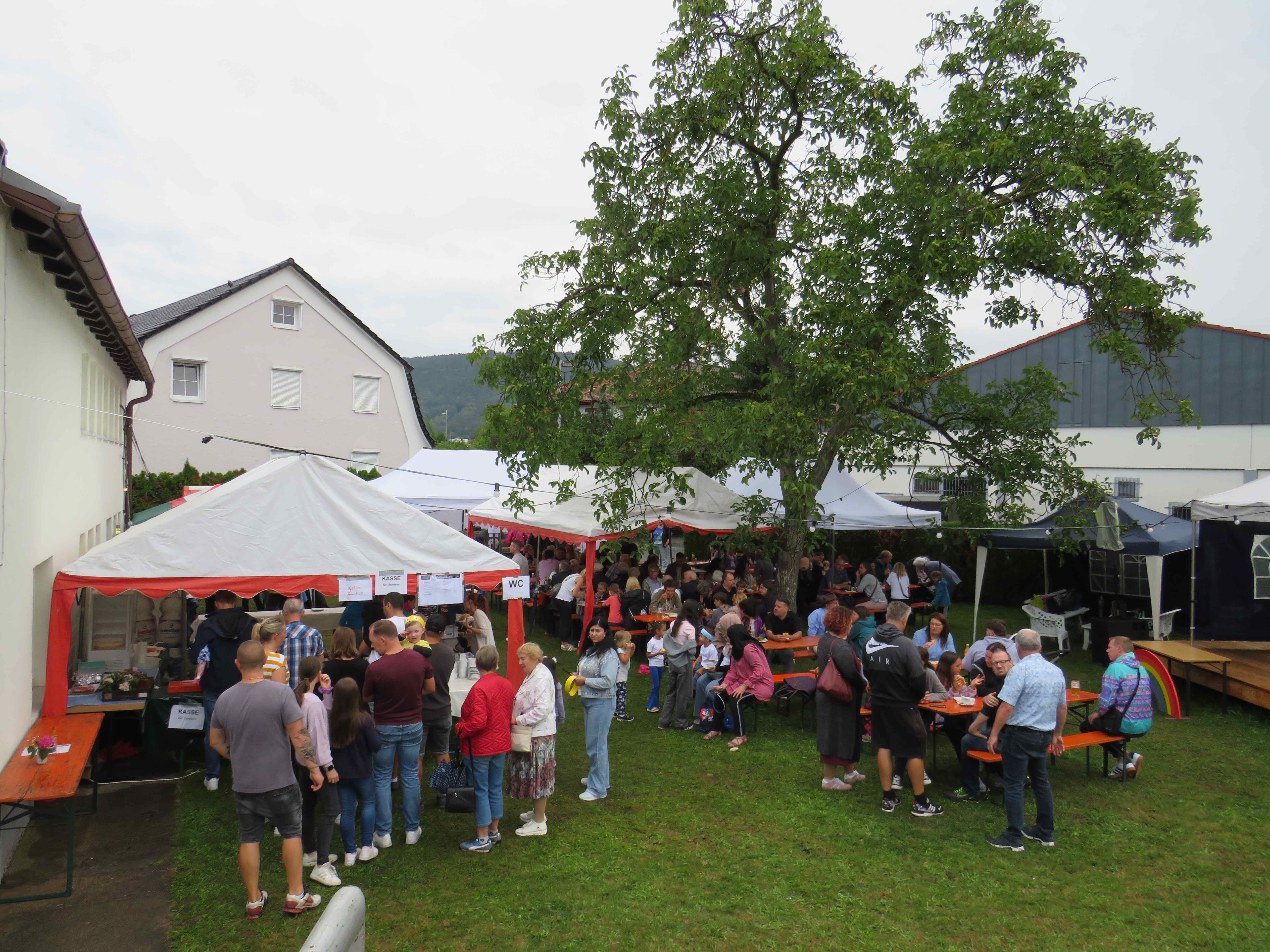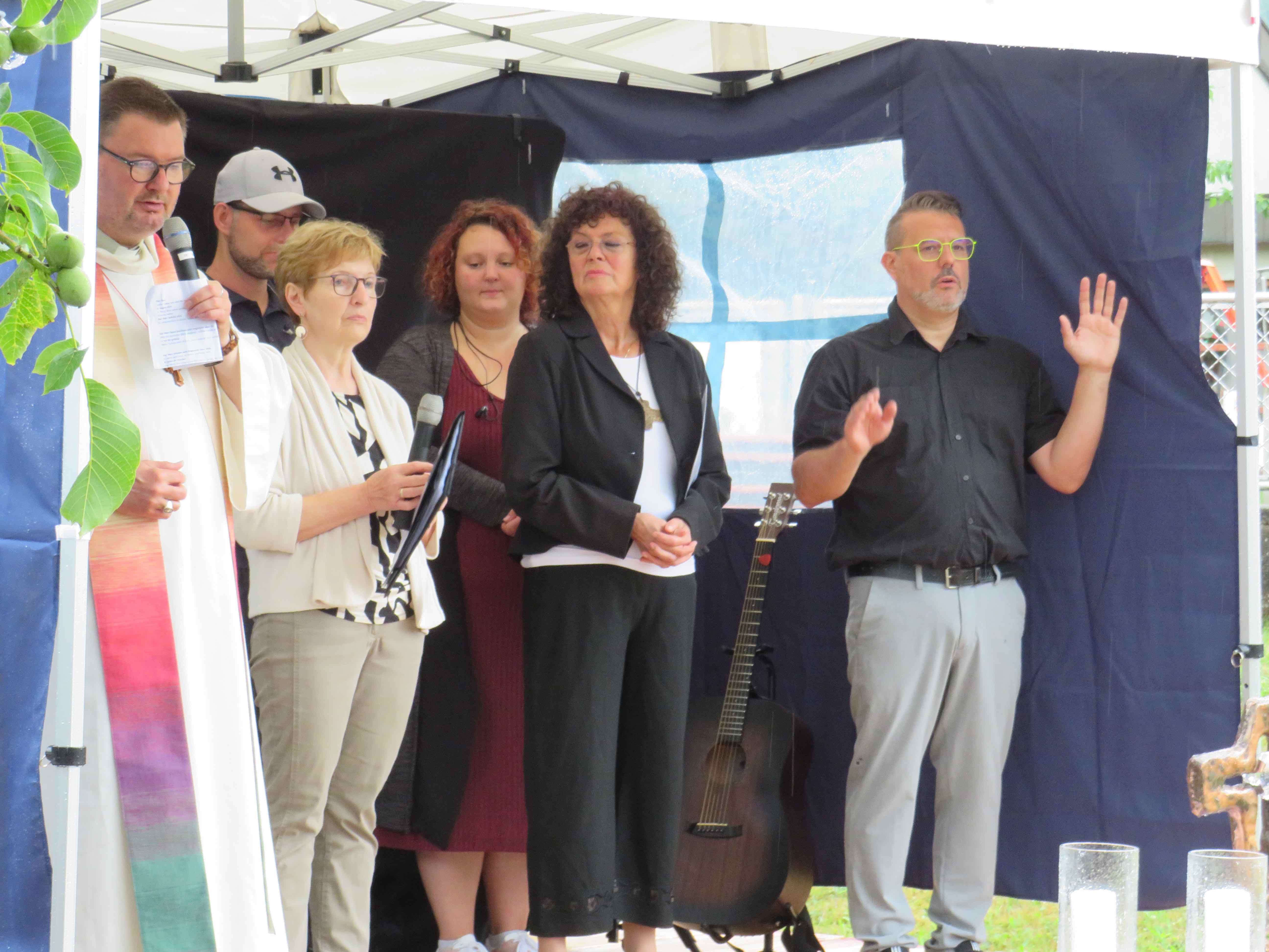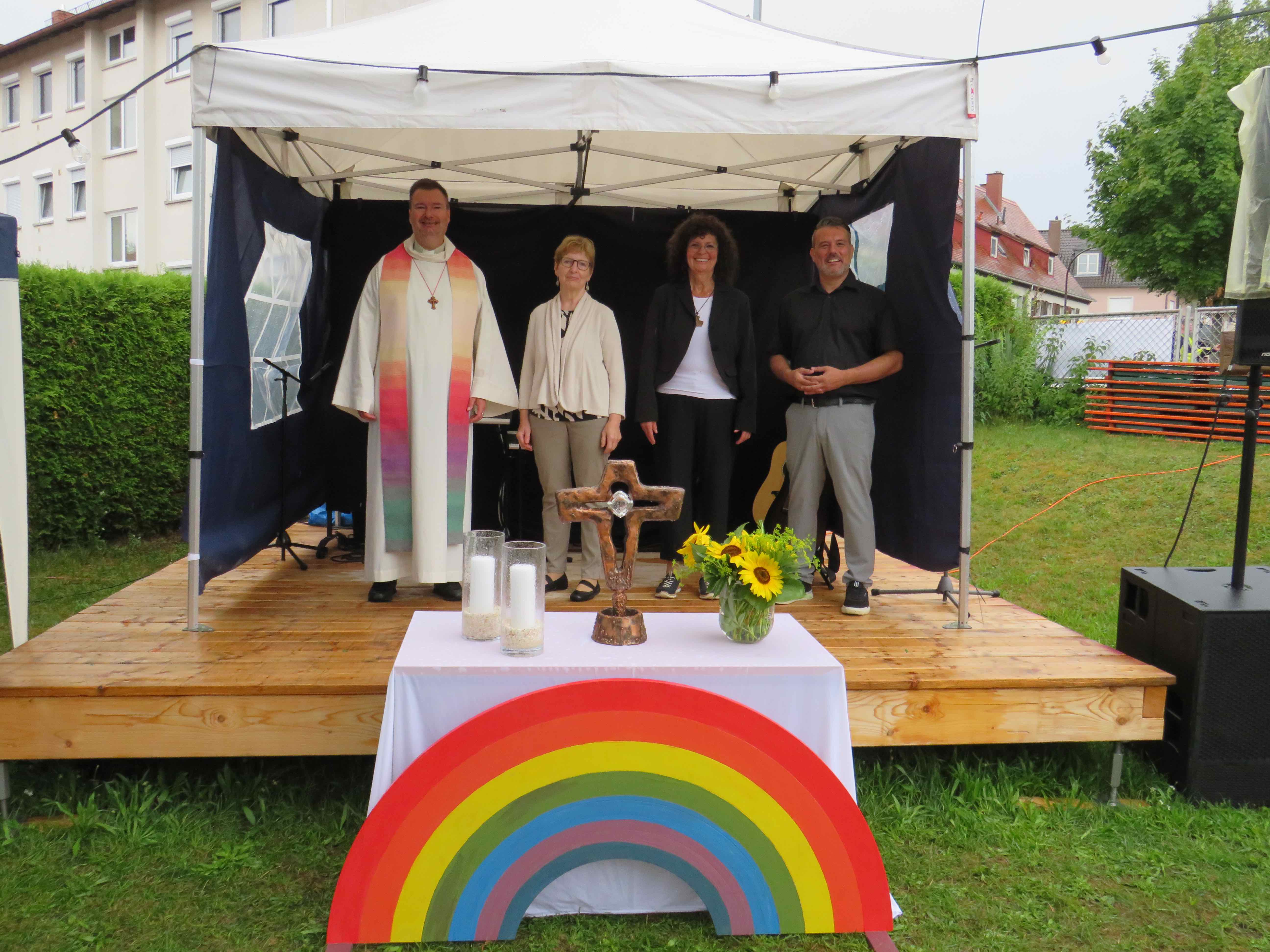 Der Regenbogen sei das diesjährige Symbol des Gemeindefestes; er komme nicht nur im Gottesdienst, sondern auch im Singspiel der Ökum. Kinder- u. Jugendkantorei vor („Noah und die coole Arche“). Er sei ein starkes Zeichen Gottes und stehe wie das Kreuz dafür, dass Gott das Heil aller Menschen möchte. Einen Regenbogen könnten wir nicht entstehen lassen, jedoch dürfe jeder mit Hilfe der ausgeteilten Fläschchen Seifenblasen herstellen, die in Regenbogenfarben schimmerten. Passend dazu spielten Frau Hofherr und Frau Neike das Lied „Regenbogen, buntes Licht“ auf der Gitarre. Der Schlusssegen wurde von Vertretern der drei christlichen Gemeinden gespendet.