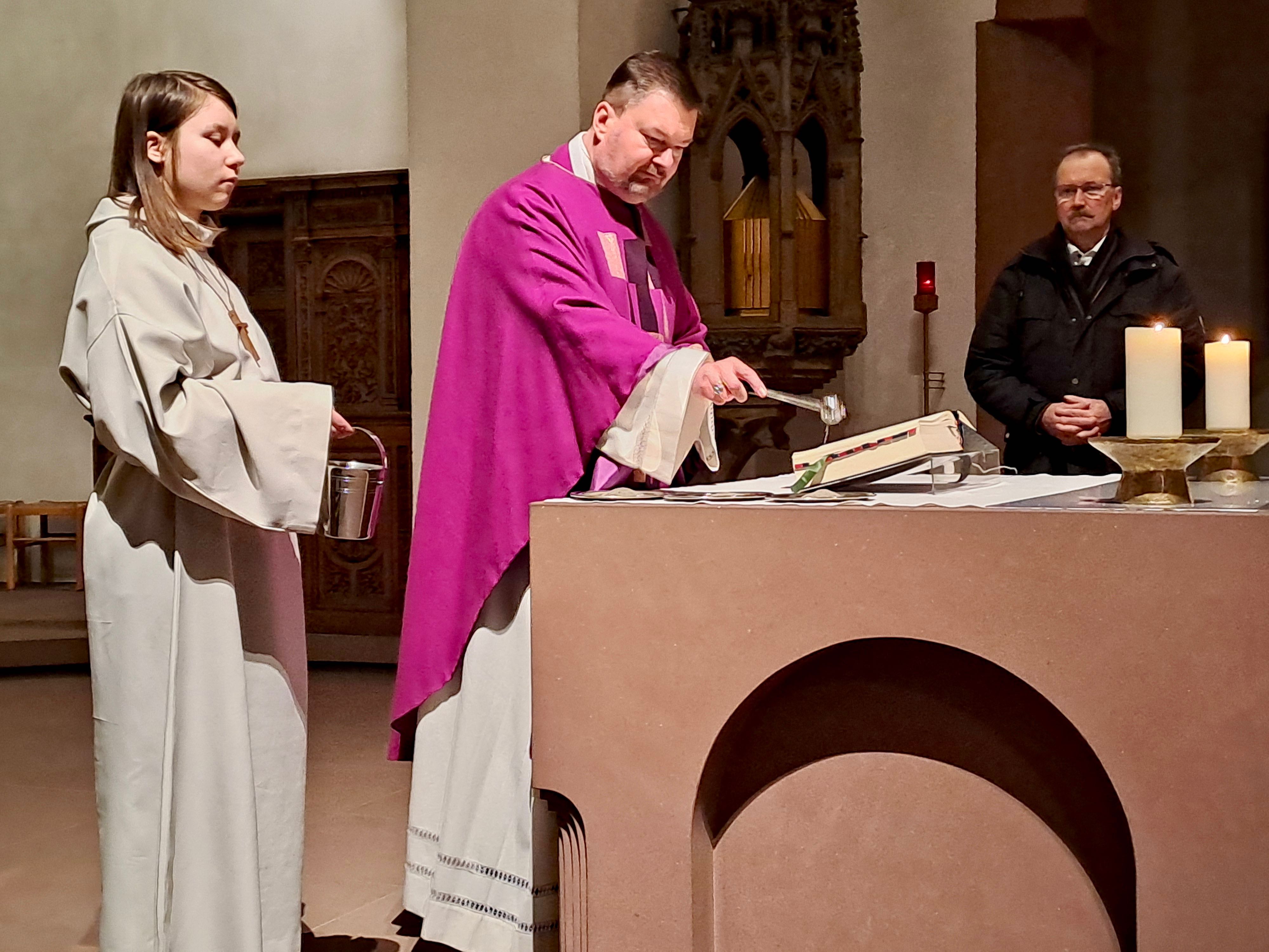 Es gelte, in der Fastenzeit bewusst auf etwas zu verzichten und sich von dem Gedanken zu befreien, immer alles haben zu müssen. In dieser Zeit sollten auch die Augen fasten, deshalb bitte er nun die Ministranten Hannah und Raphael, das als Triptychon ausgestaltete Altarbild zu schließen. Normalerweise erfolge zu Beginn der Messfeier der Bußakt. Dieser finde heute nach der Predigt in Form der Auflegung des Aschenkreuzes statt.