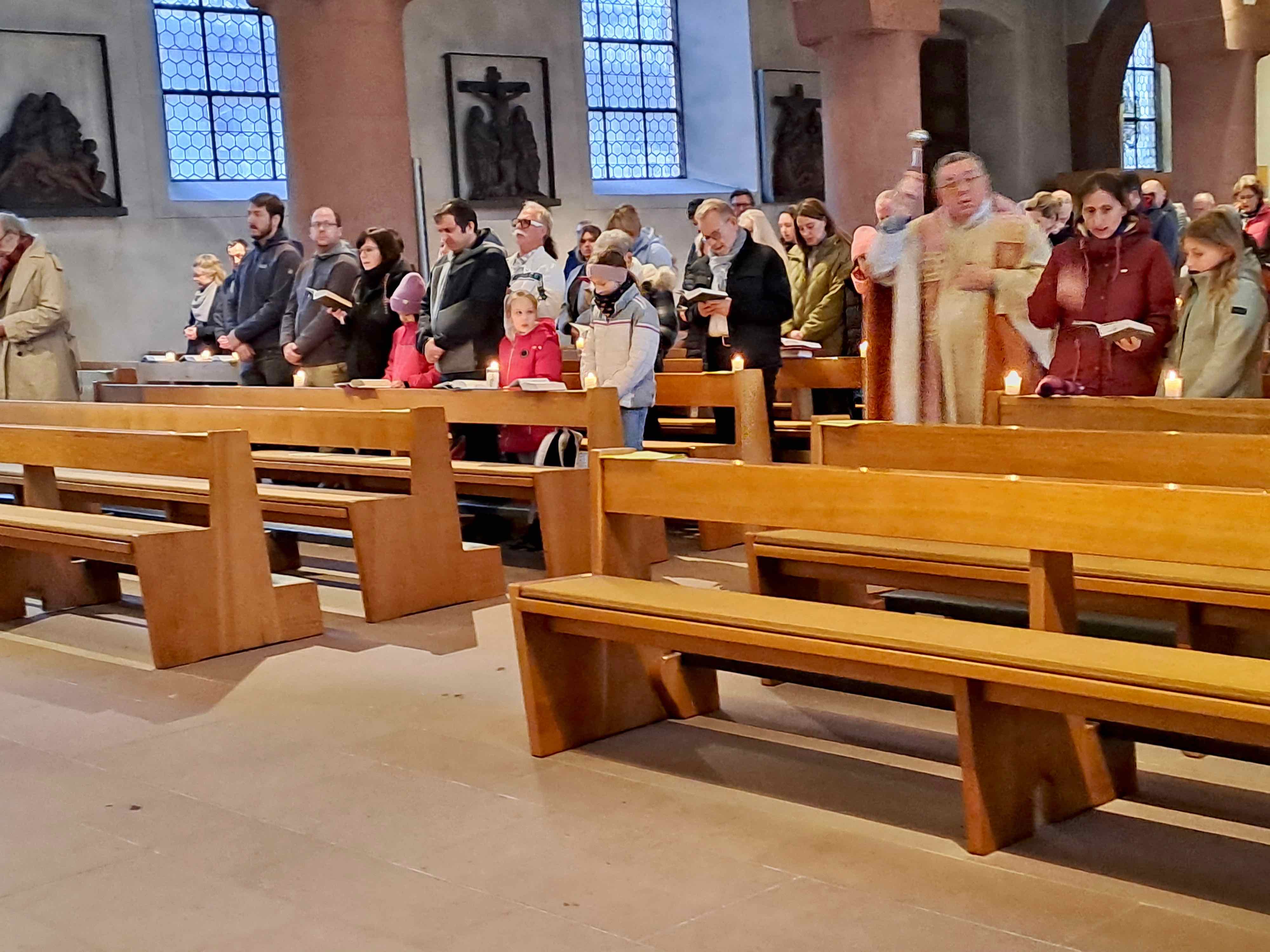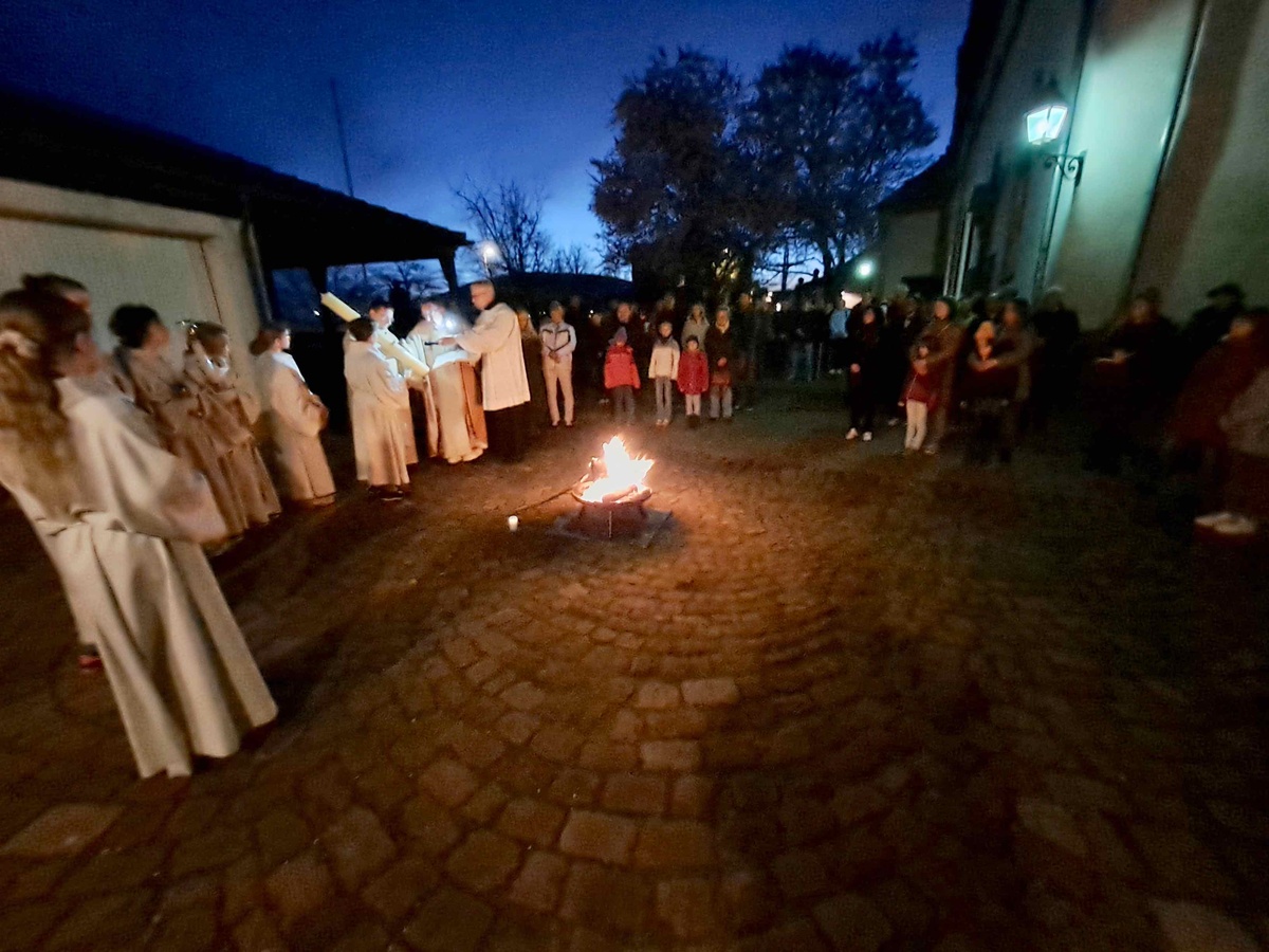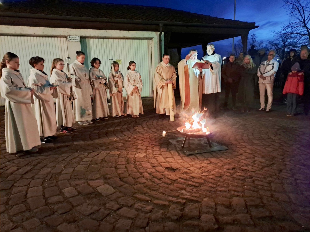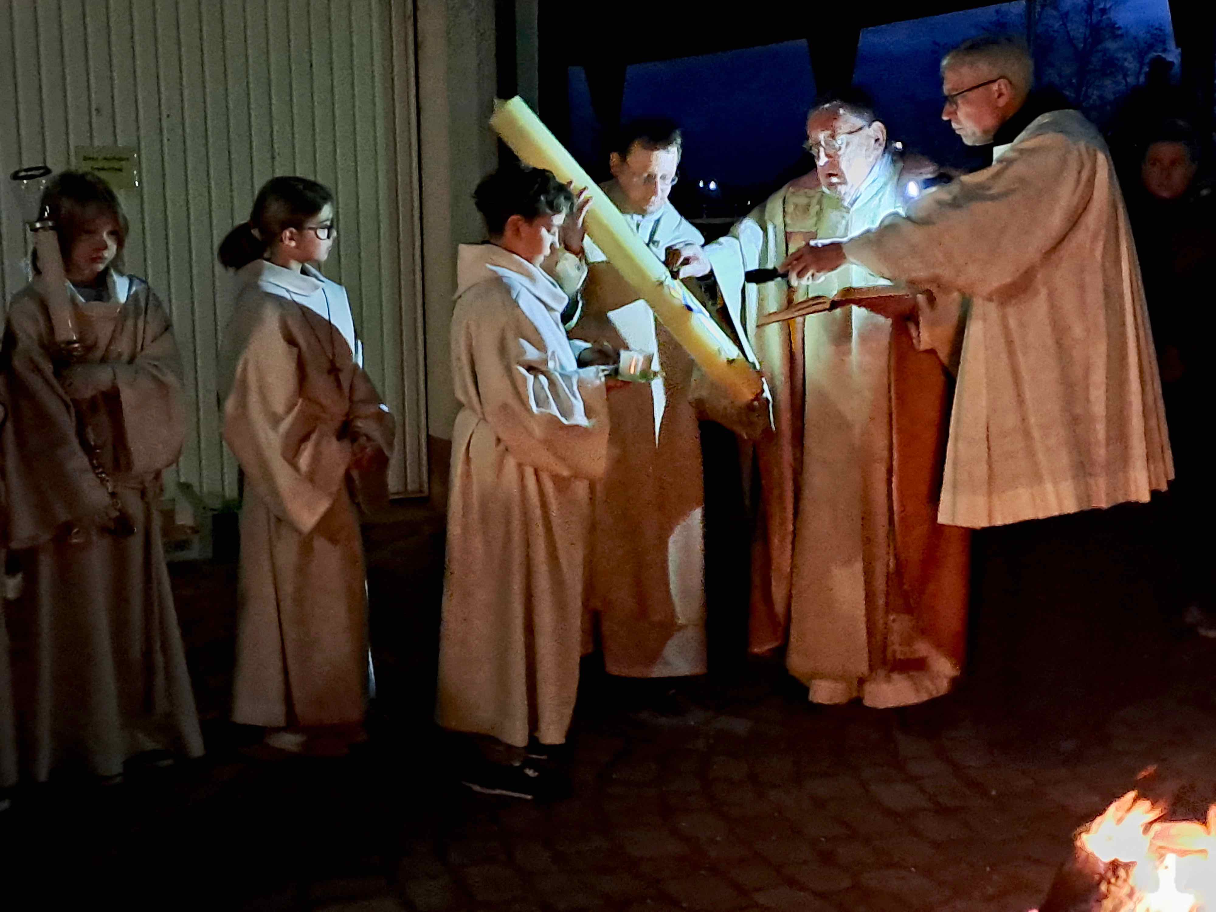 Pfarrer Jan Kölbel, der die Osternacht zelebriert hätte, sei leider kurzfristig erkrankt, so dass er für ihn eingesprungen sei. In dieser Nacht habe Jesus den Tod besiegt und sei zum Leben hinübergegangen. Er bat Gott, das Osterfeuer zu segnen und in uns die Sehnsucht nach dem unvergänglichen Licht Gottes zu entfachen, damit wir durch Christus zum ewigen Osterfest gelangten. Schließlich bereitete er die Osterkerze und entzündete sie am Osterfeuer. Mit den Worten „lumen Christi“ (Christus, das Licht) und der Antwort der Gemeinde „deo gratias“ (Dank sei Gott) zog der Pfarrer in die dunkle Pfarrkirche ein.