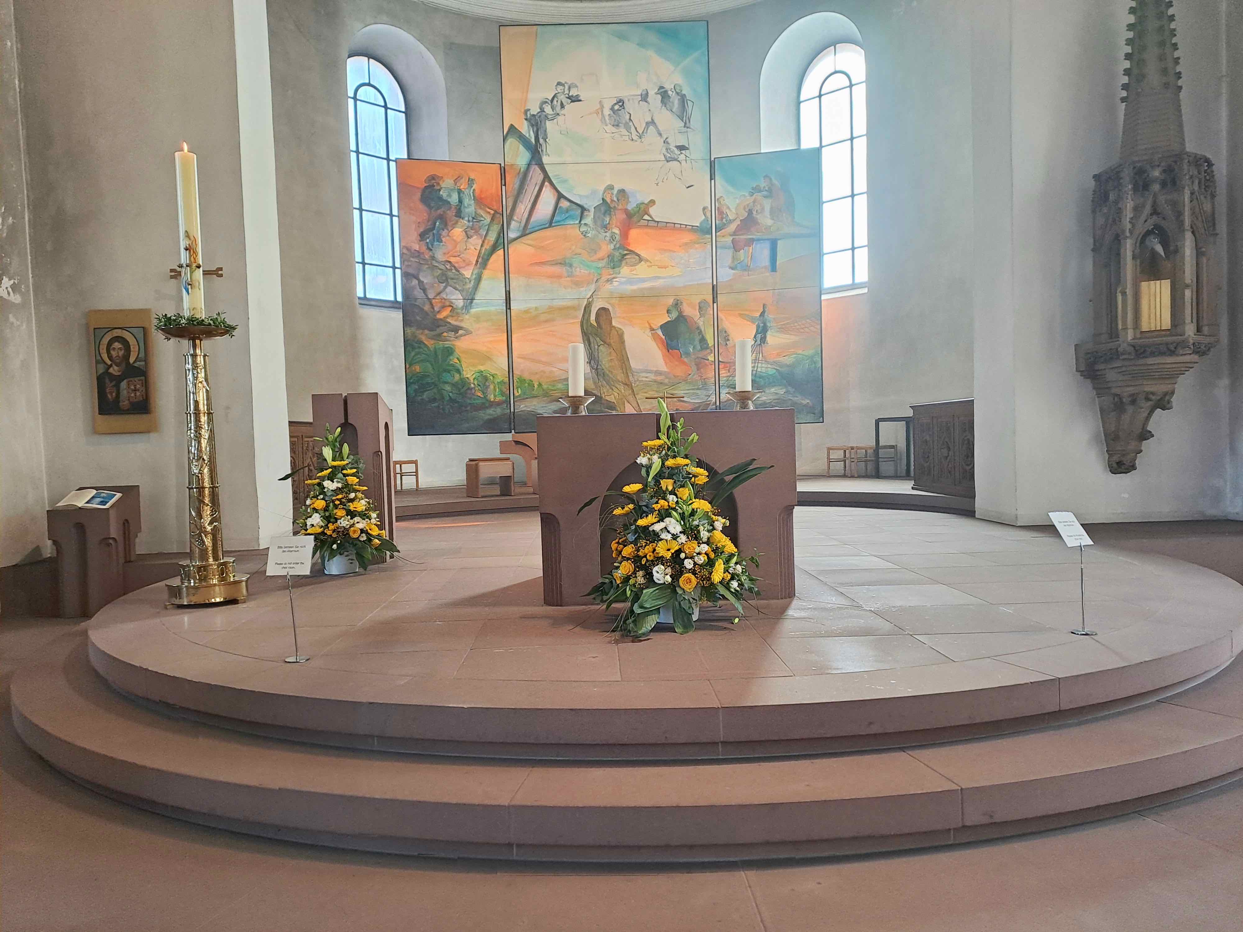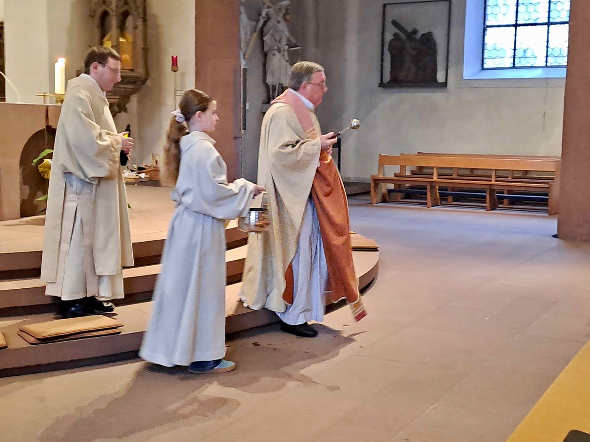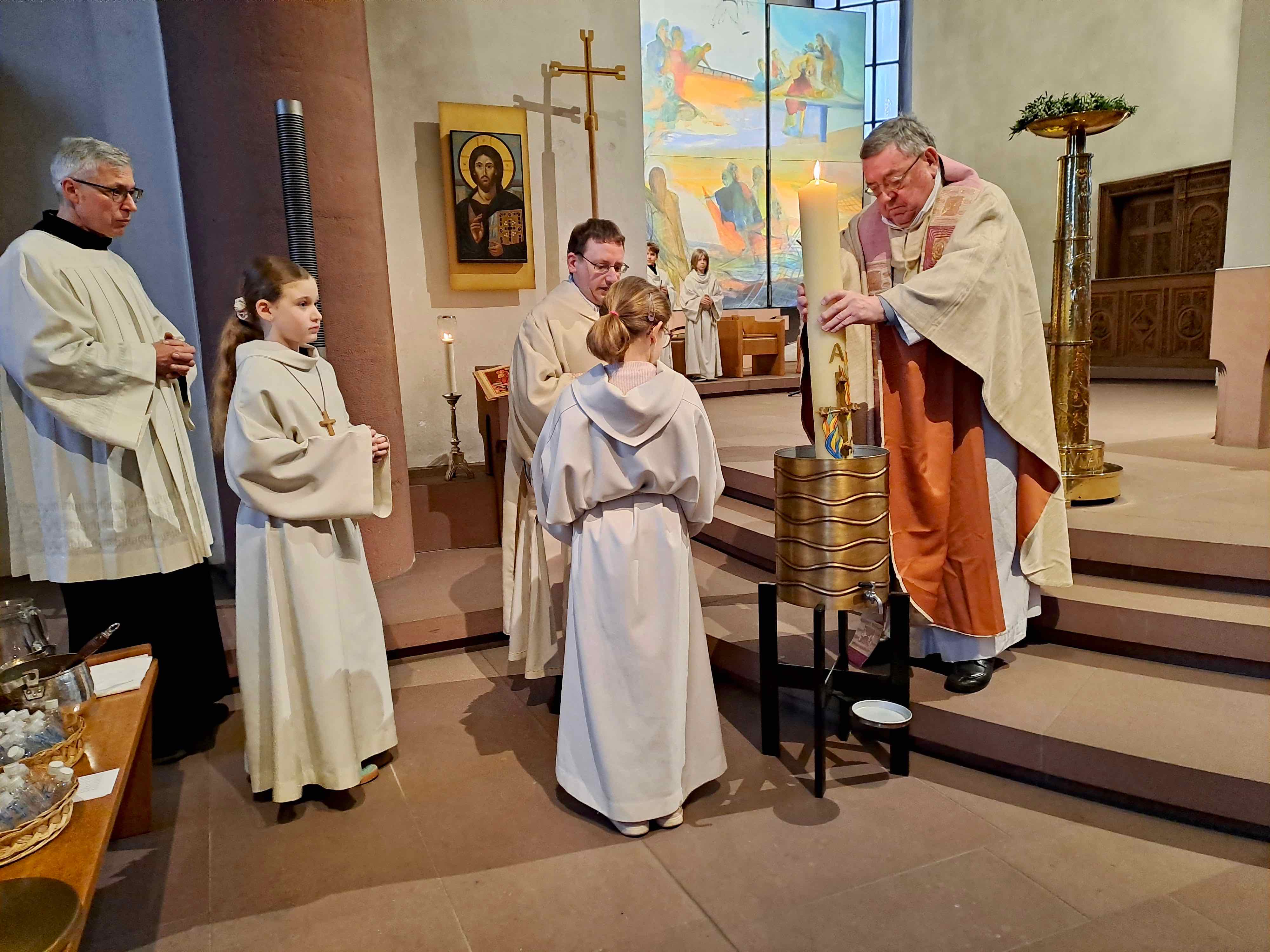 In der Kirche verteilten die Ministranten das Licht der Osterkerze an die Kerzen der Gläubigen, so dass sich das Licht Christi im Kirchenraum verbreitete. Dann sang Diakon Florian Grimm das Osterlob. Nun folgten Lesungen aus dem Alten und dem Neuen Testament, in denen das Heilswerk Gottes und seine Erlösungstaten für sein Volk zum Ausdruck kamen. Insbesondere durch das Wasser der Taufe führt er die Menschen zur Freiheit. Zum feierlichen „Gloria“, gesungen von der Schola und der Gemeinde, erklangen zum ersten Mal seit Gründonnerstag die Orgel und die Glocken. Die Minis klappten das über die Fastenzeit geschlossene Altarbild wieder auf und die Beleuchtung wurde eingeschaltet. Diakon Florian Grimm verkündigte das Evangelium von der Auferstehung Jesu nach dem Evangelisten Johannes.