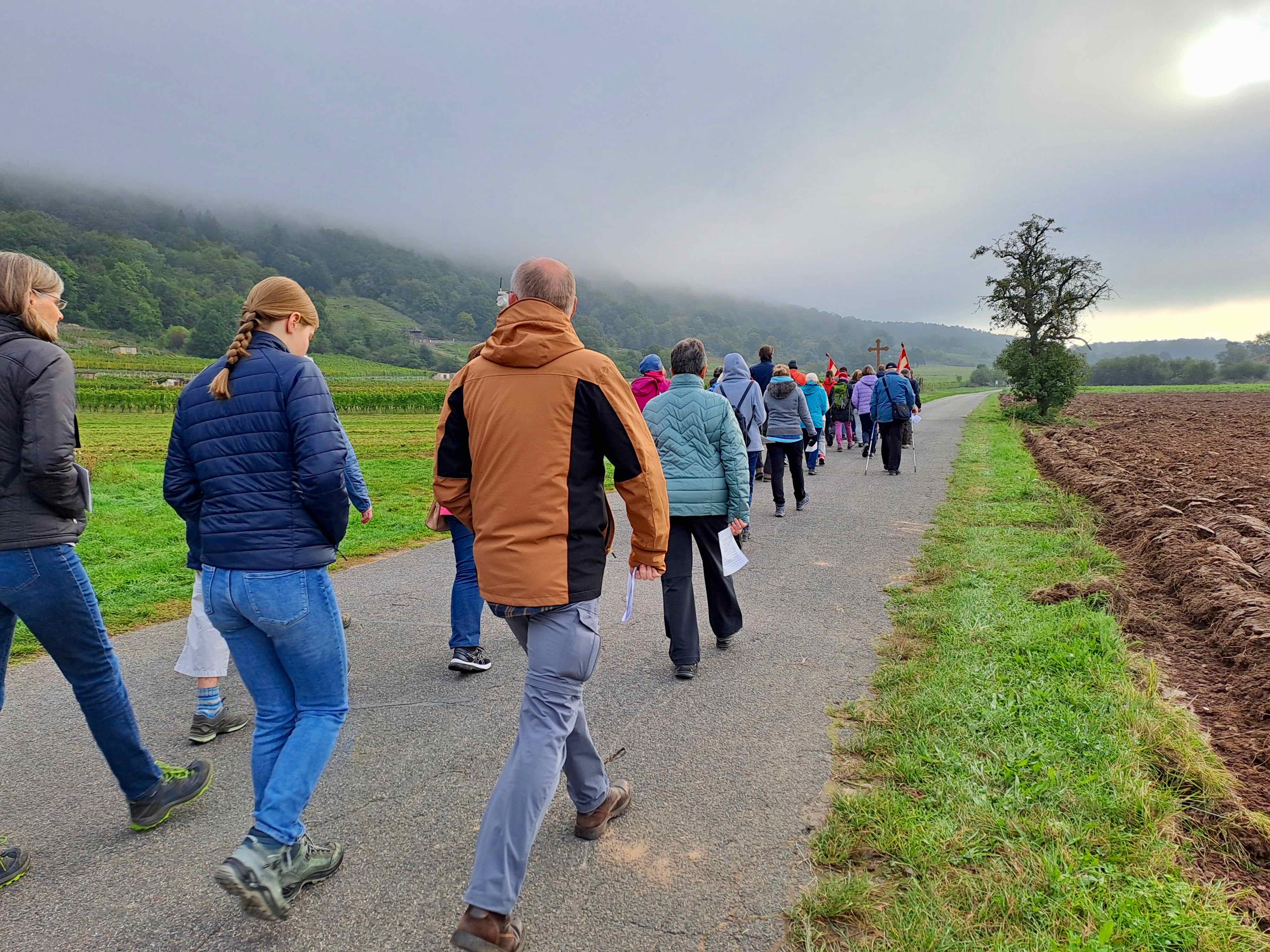 Nach einem Lied und dem gemeinsamen Gebet für die PG erteilte der Pfarrer den Pilgersegen und die Gruppe machte sich auf den Weg zur ersten Station an der Maria-Hilf-Kapelle.