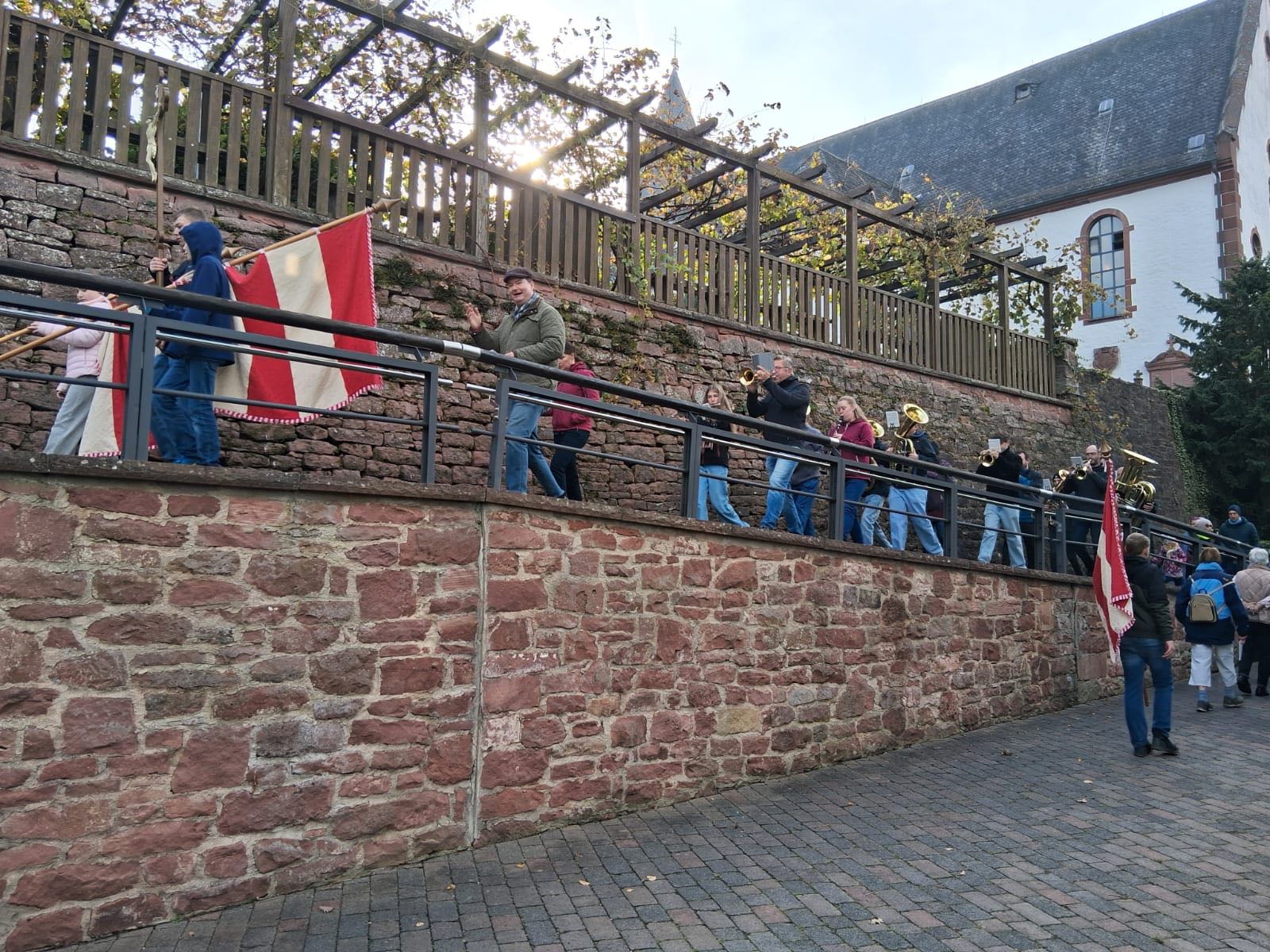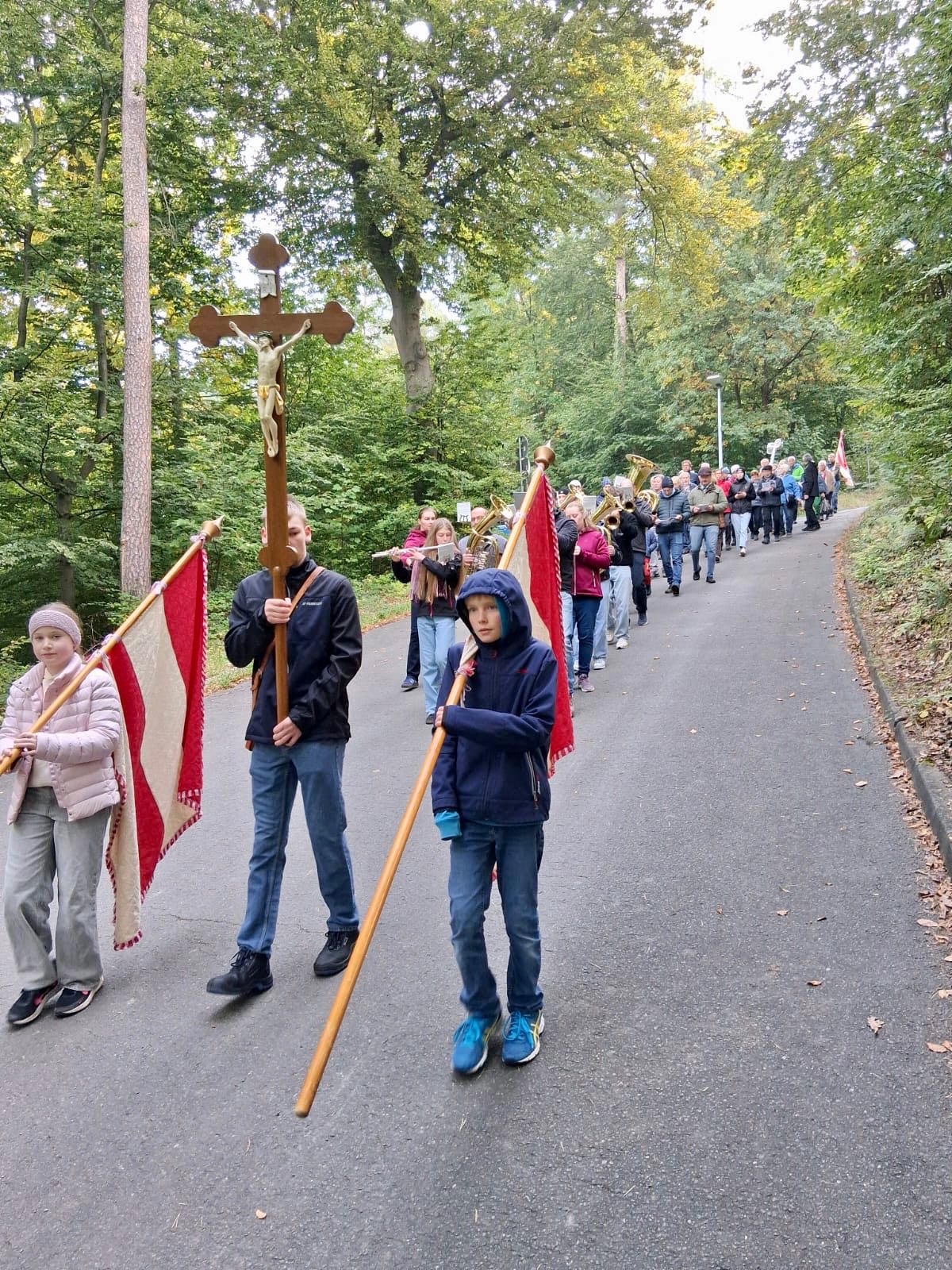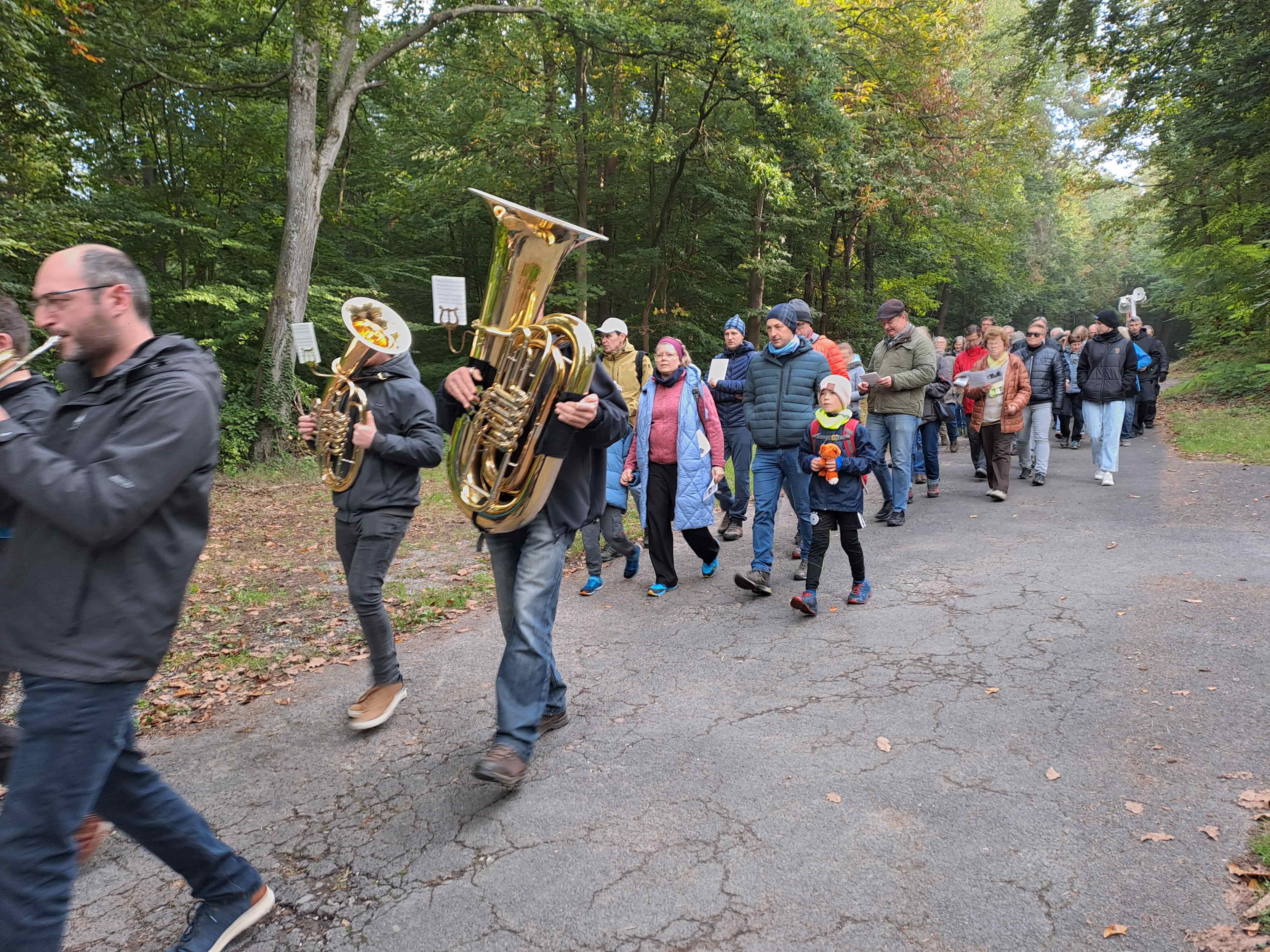 Auf dem Parkplatz am Engelberg kam die Trachtenkapelle Wenschdorf-Monbrunn dazu, welche die musikalische Begleitung an der Station im Franziskusgarten und im Gottesdienst in der Klosterkirche übernahm.