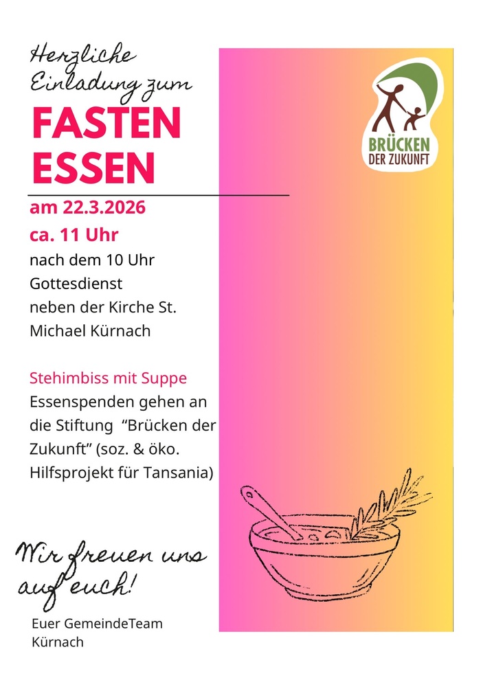 Deshalb laden wir Sie am 22. März ganz herzlich zu einem Stehimbiss im Anschluss an den Gottesdienst neben der Kirche ein. Wir freuen uns, wenn Sie sich nach dem Gottesdienst noch etwas Zeit nehmen. Genießen sie eine kräftige, schmackhafte Suppe. Kommen Sie mit anderen Gemeindemitgliedern ins Gespräch. Ihre Spende für das Essen leiten wir an die Stiftung „Brücken der Zukunft“ weiter. Die Stiftung unterstützt u.a. die Bildung, Erziehung und Gesundheit von Kindern, sowie die Förderung von nachhaltiger Forst- und Landwirtschaft in Tansania. Weitere Infos zur Stiftung finden Sie unter